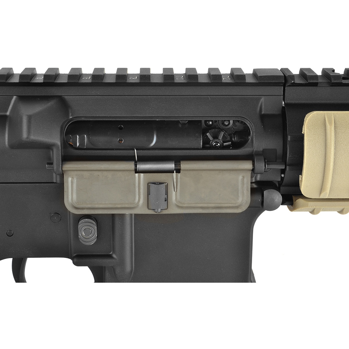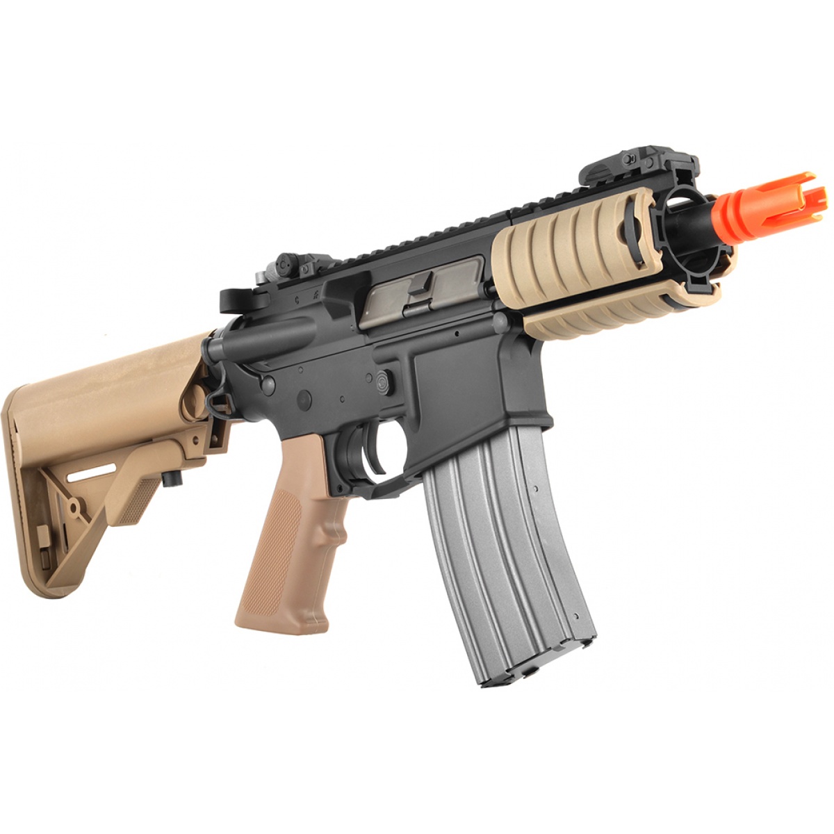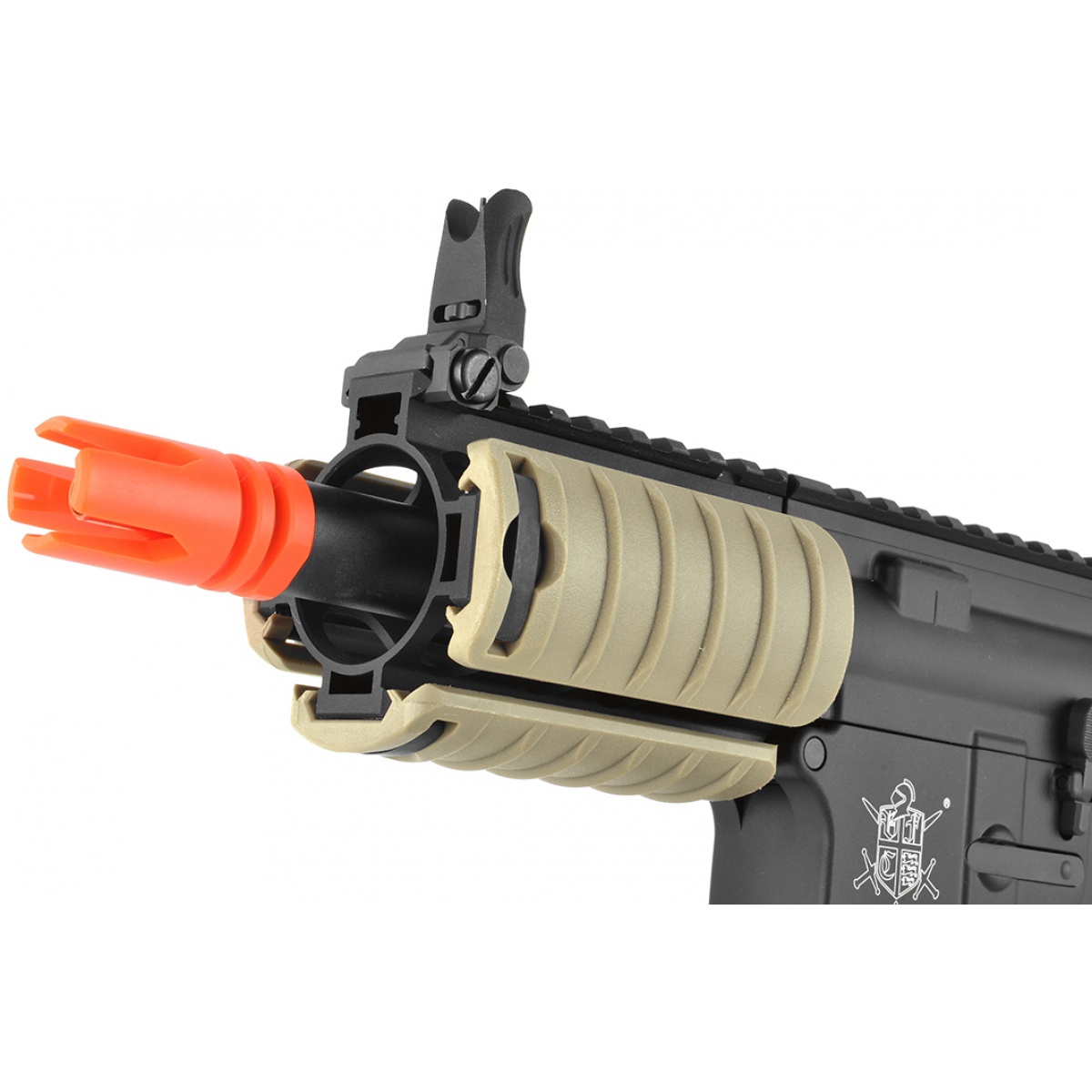 If you liked the VFC M4 Stinger AEG, this version is rear wired and comes equipped with a retractable crane stock for battery storage. The VR16 M4 Dagger AEG performs best in CQB (Close Quarters Battle) engagements. The compact size of the Dagger allows players to quickly maneuver around corners and take out the opposing team. While this airsoft M4 features flip-up front and rear sights — which you can easily remove — the top optics rail allow for mounting dot sights and scopes. In addition, this AEG features a compact, 3.5-inch full metal RIS/rail system that’s perfect in length to mount any additional accessories. Internally, this AEG comes with the famous self-shimming VFC gearbox, which reduces stress on the gears and allows for smooth performance. It has also proven to be one of the best stock gearboxes available. Notable internal components include an aluminum piston head for improved strength, M100 gearbox spring for field-legal muzzle velocity, and 8mm polycarbonate bearings unseen in most AEGs right out of the box. If you’re a player looking for a reliable CQB-ready AEG that will dominate the competition in closed quarters combat, then this VFC Dagger VR16 AEG shoots to the top of the list as a must-have CQB airsoft rifle.