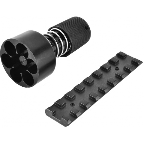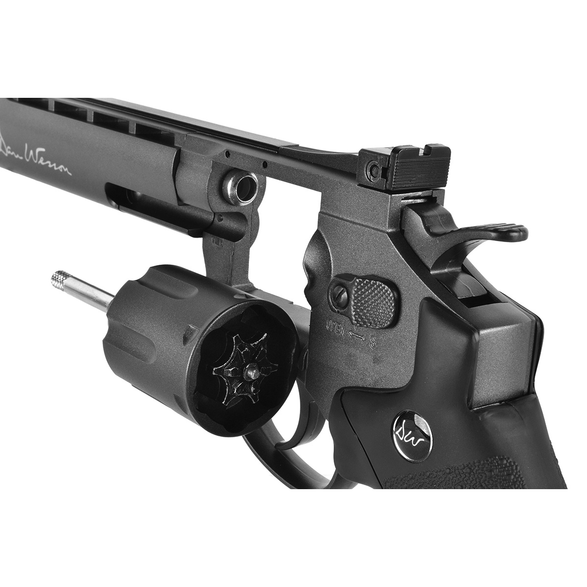If you could create a pistol with the best features from a variety of different categories and mix in a unique finish, you’d end up with the ASG Dan Wesson 6" CO2 NBB Airsoft Revolver. Its CO2 non-blowback system significantly conserves gas consumption compared to gas blowback pistols. This full metal, officially licensed airsoft CO2 revolver shoots between 440 and 450 FPS (w/ 0.20g BBs) and is able to go trough nine reloads (54 rounds) before marginally dipping below 400 FPS. The 6-inch barrel gives accuracy at distances much greater than most other airsoft pistols, and with the windage/elevation adjustable rear sights, target acquisition isn’t a problem. Included with the Dan Wesson Tactical 6" Revolver is an optics rail segment, allowing you to attach sighting systems (red dot sights and magnified optics). Another notable feature is the shell reloading system. To keep with the pistols overall realism, the functioning cylinder slides out, which holds up to six BB shells. As with any double-action revolver, this airsoft revolver can be cocked back each time in order to shorten the trigger pull. The speedloader included with this great CO2 airsoft pistol quickly and painlessly reloads the revolver. Unlike most larger airsoft pistols, the ASG CO2 Revolver fits comfortably in any size shooters hands, and its modern ergonomic grip provides a comfortable grip for better weapons manipulation.