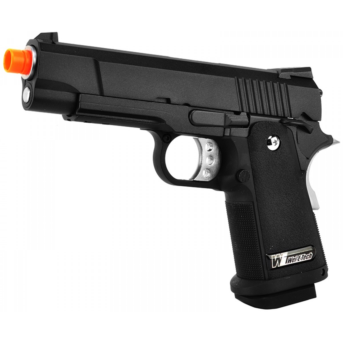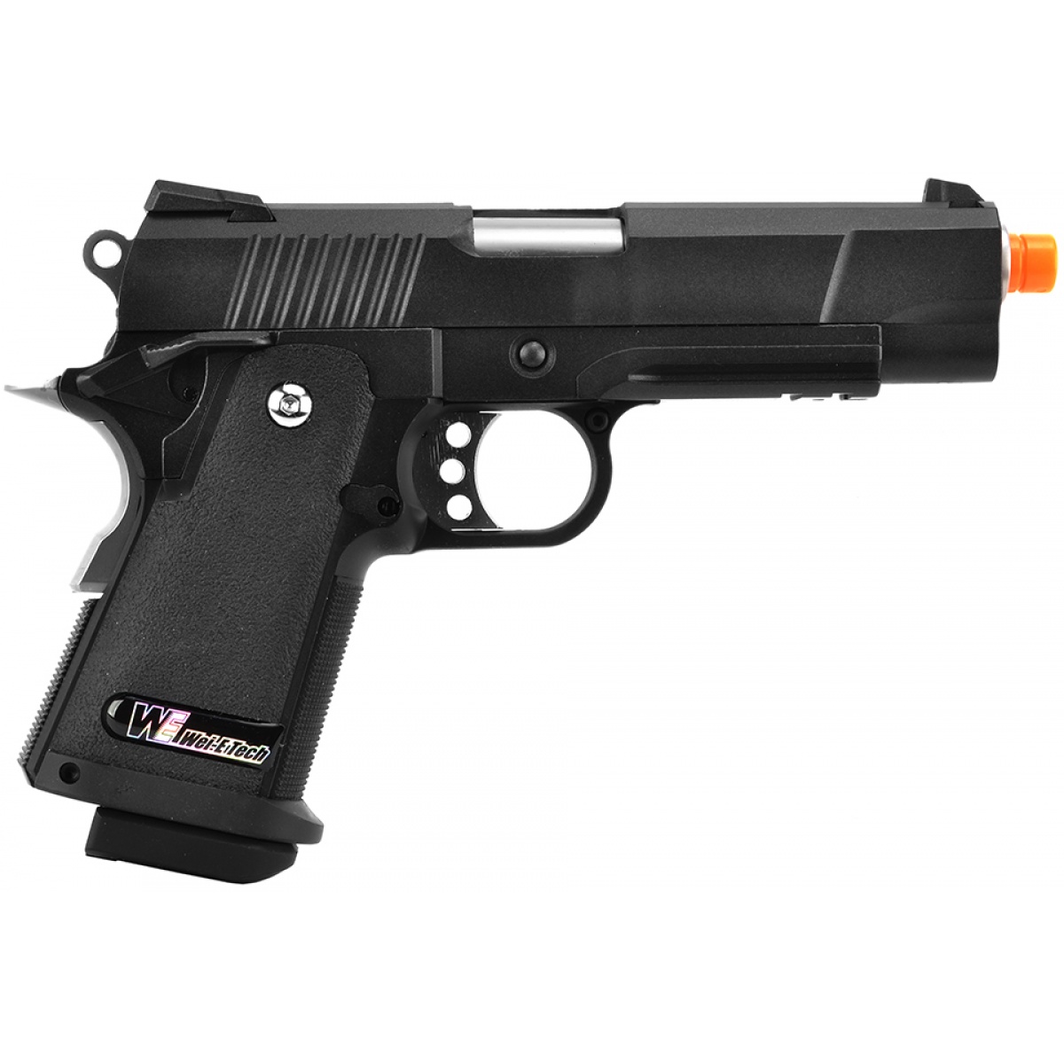 From the slide to the frame, the WE Tech S-Hi-Capa 4.3 GBB Pistol is constructed of full metal, giving it realistic weight and an authentic feel. This gas blowback pistol, which features the same rugged internal and externals parts of the Hi-Capa 1911 series, comes with a double-stacked magazine that holds up to 28 rounds! Features like the skeleton trigger and commander style hammer add a tactical modern finish to this GBB pistol. To prevent accidental firing, and as seen on real steel M1911s, the beavertail safety is fully functional as well as the ambidextrous thumb safeties. If you’re looking for a gas blowback M1911 pistol with realistic weight and a compact build perfect for all players, the WE Tech S-Hi-Capa GBB Pistol is must-have sidearm to add to your armory.