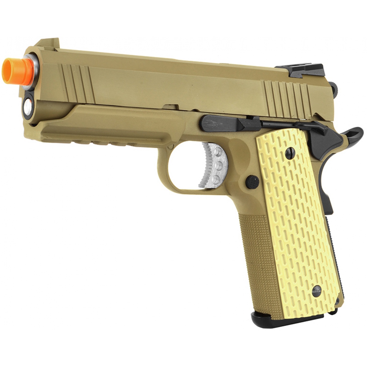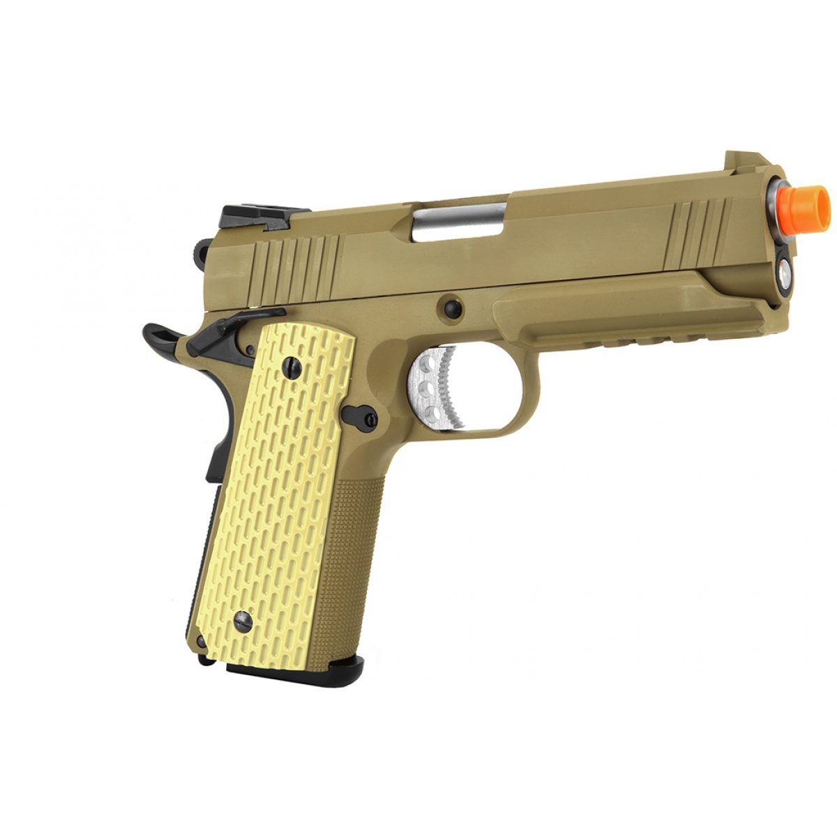 This full metal WE Desert Warrior 4.3 Compact M1911 gas blowback pistol has been upgraded to increase gas efficiency and provide consistent power behind every shot. This tactical Desert Warrior 4.3 M1911 comes in an amazing desert tan finish and is one of the best looking M1911 gas blowback pistols currently available.