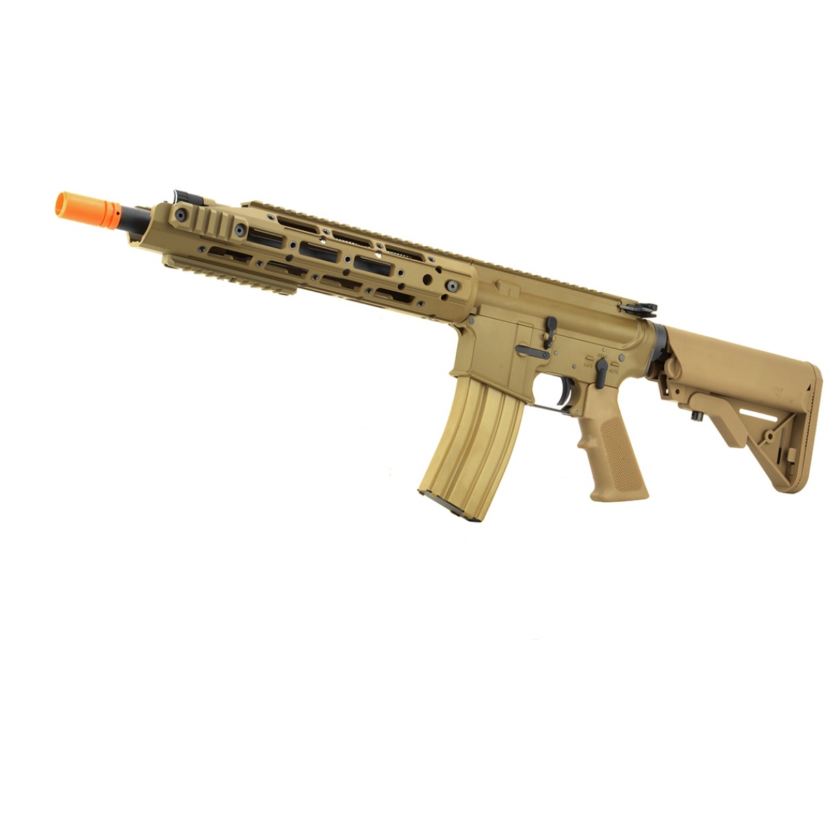 Constructed with full metal furniture, from the receiver to the barrel, the WE Tech M4 Raptor GBBR features a modular handguard, an open bolt gas blowback system, and plenty of rail space for airsoft optics (red dot sights and magnified scopes). The WE Tech M4 Raptor GBBR is one of the finest gas blowback guns on the market, easily shooting up to 450 FPS (w/ 0.20g BBs). Designed with an open bolt system for maximum realism, this M4 GBBR functions and even field strips like the real M4. But most of all, its modular free-float handguard allows you to mount an assortment of tactical accessories, including LED flashlights, pressure activated lasers, and angled vertical grips. This airsoft rifle comes with a speedloader for fast reloads, barrel wrench to install aftermarket handguards (RIS/RAS), and with a 30-round gas magazine perfect for military simulation (MilSim).