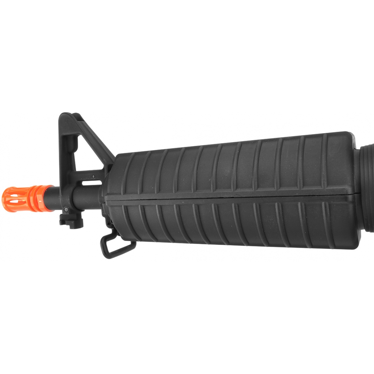 Lancer Tactical’s M4 Commando is a top contender for close quarters combat. Its overall shortened barrel and lightweight build increases maneuverability, making it a practical choice for close-range engagements. But what separates this M4 Commando from other similar AEGs is that the Lancer Tactical LT-7018 Airsoft Rifle is built with a full metal upper and lower receiver. This makes it extremely durable yet still light enough to move quickly from spot to spot. The 11-inch metal outer barrel, combined with a retractable LE stock, gives you a perfect overall length to rapidly move in and out of cover without having a cumbersome rifle. But don’t let its streamlined design convince you for its lack of modularity. Shooters can easily upgrade to a drop-in quad rail system for mounting vertical grips, push-button flashlights and other accessories. You can also replace the removable carry handle with a combination of back-up rear sights and micro dot sights for enhanced target acquisition. Additionally, a reinforced Version 2 gearbox and CQB-rated spring yields field-legal muzzle velocity, outputting a consistent range between 380 to 420 FPS (w/ 0.20g BBs).
