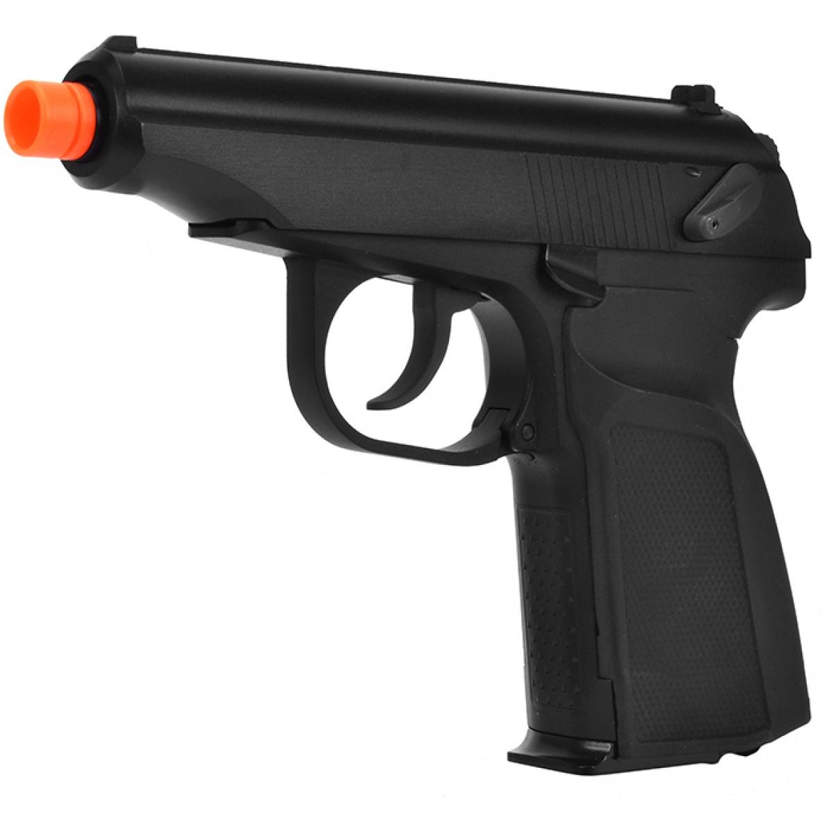 The entire frame of the WE Tech Makarov is constructed from durable metal, making it highly durable and also giving it a realistic weight. To improve shooter comfort a plastic wrap-around grip covers the pistol grip, and is also stippled on the sides and backstrap for better weapon control. On each side of the slide, serrations provide a positive gripping surface to make cycling the slide effortless. The WE Tech Makarov has a slide mounted safety lever that is positioned perfectly for easy access, so you can take the safety off quickly when you need to engage your opponents.