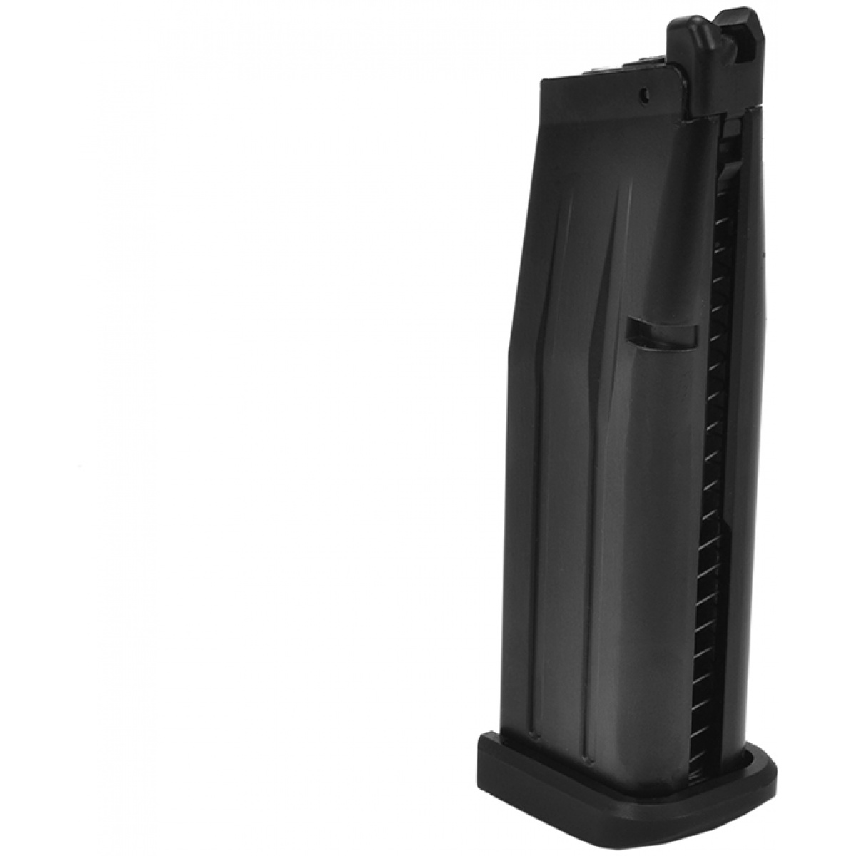 The magazine well is flared to facilitate quick and easy reloading, even in the most stressful environments. This also helps to keep your grip on the weapon high on the frame to control the recoil generated by the gas blowback action. The magazine, charged with Green Gas from the bottom, holds 24 rounds and feeds flawlessly even during periods of rapid fire engagement. Just like a real steel handgun, the slide on the WE Tech Velociraptor locks to the rear when all rounds have been fired.