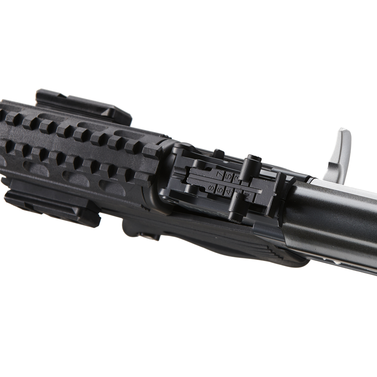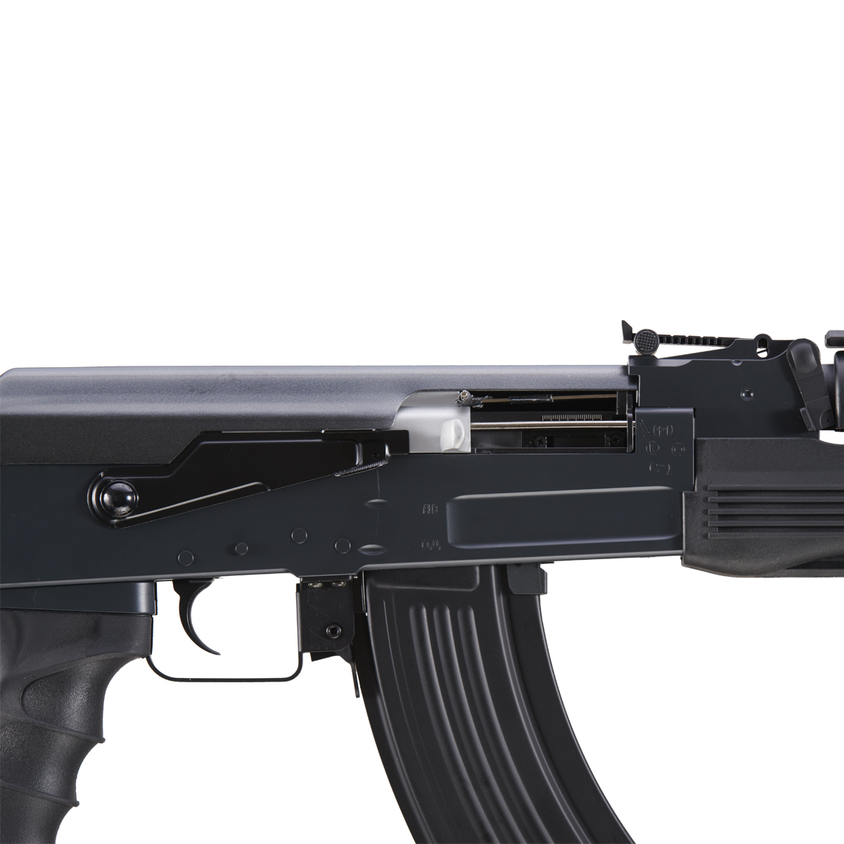 Build Metal trigger assembly, barrel, sights / Polymer receiver, motor grip, stock, handguard