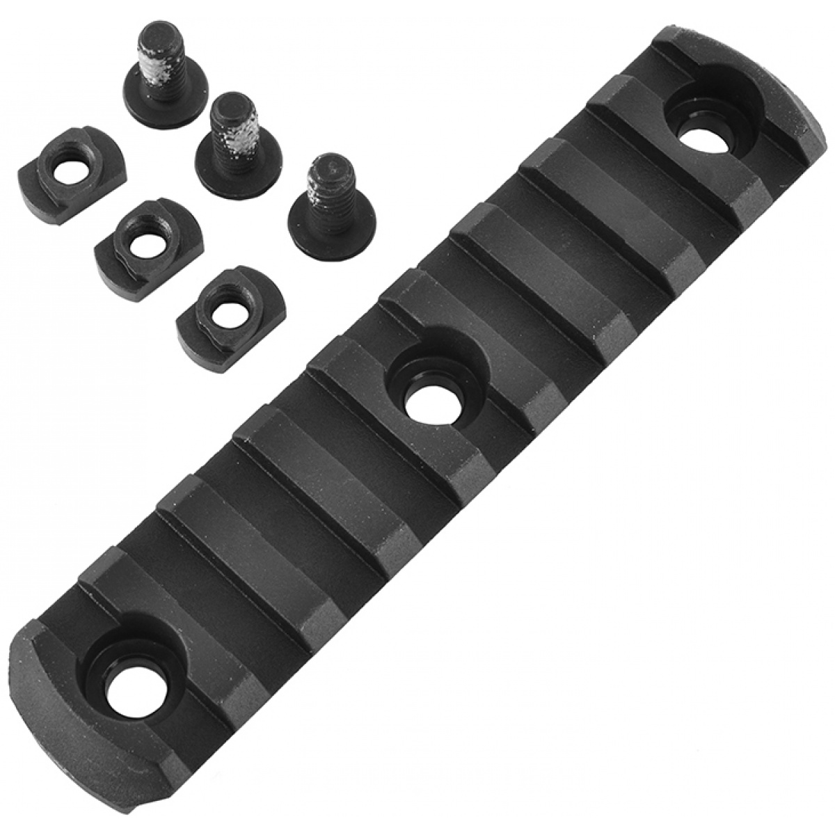 The Magpul M-LOK Picatinny RIS, designed for airsoft guns with M-LOK compatible hand guards, make quick work of attaching 1913 Picatinny rail accessories to airsoft guns with Magpul M-LOK hand guards. Injection molded from a proprietary reinforced composite, these Picatinny rail sections are a lightweight and cost effective alternative to a full metal Picatinny rail forend. Each RIS section is beveled on the sides and at each end to eliminate sharp edges and reduce snagging for secure and worry-free accessory mounting. The cammed T-nuts and recoil/impact mitigation lugs keep the Picatinny RIS securely in place in even the most demanding of environments.