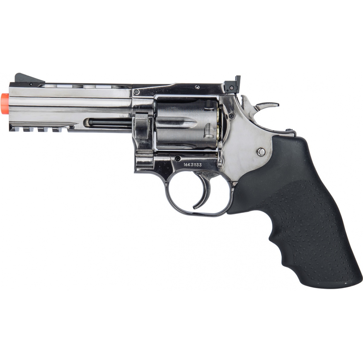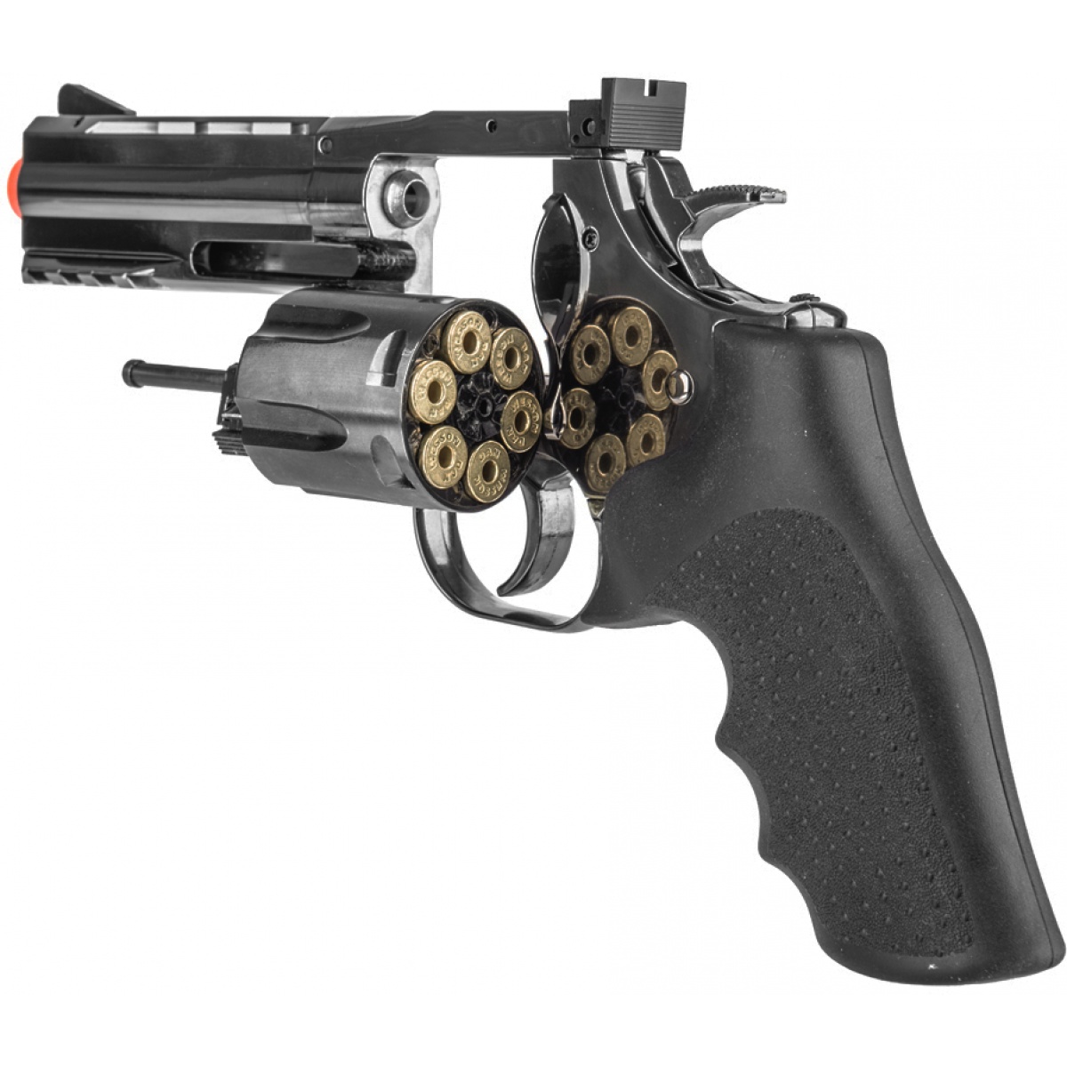 • CO2 non-blowback revolver includes an adjustable hop-up for a custom ball spin
