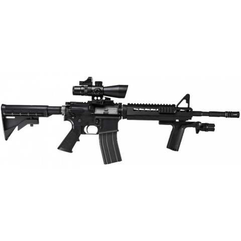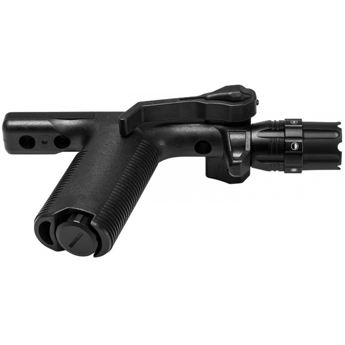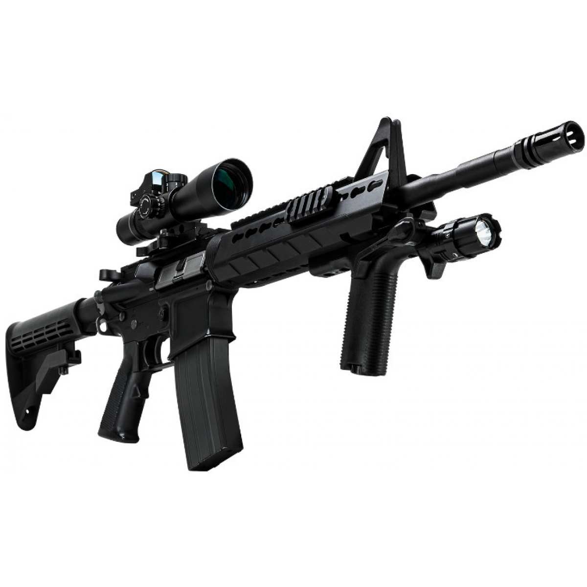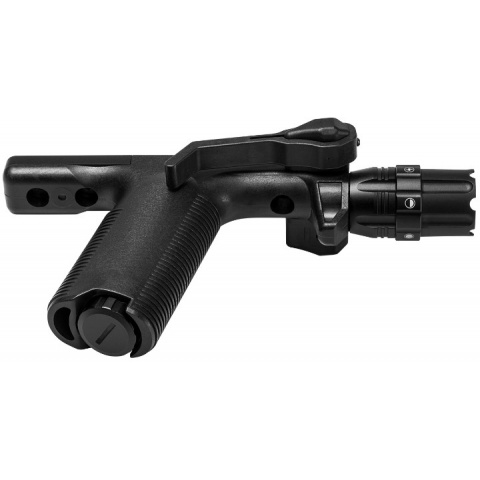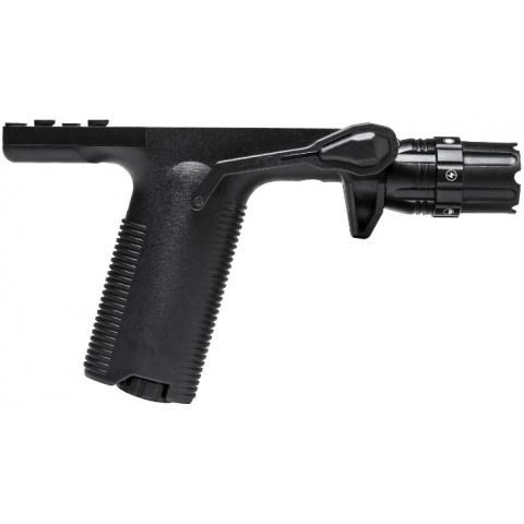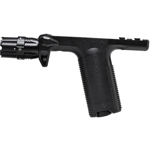 This tactical vertical grip by NcStar is constructed of quality black anodized aluminum metal and polymer with an integrated LED strobe light. This grip is compatible with KeyMod and Picatinny styled rail systems for the M4/M16 airsoft AEG series. This vertical grip features an ergonomic textured lightweight grip with an ambidextrous switch design. The tactical 3 setting LED strobe light is powered by 2X CR123A lithium batteries to ensure full performance.
