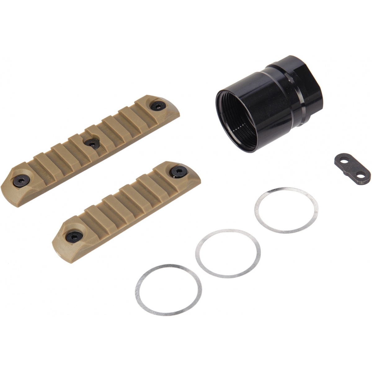 • - Rail interface system comes with barrel nuts and two MIL-SPEC Keymod rails.