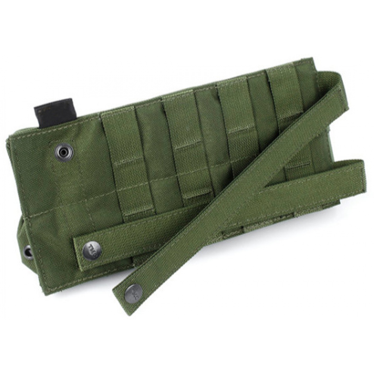• - P90 magazine pouch contains MOLLE webbing for tactical gear.