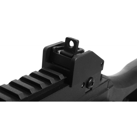 The externalcomponents of this compact airsoft carbine are made from high densitynylon polymer, making the rifle much more durable than its ABS polymercounterparts. Heckler & Koch trademarks, licensed by Umarex, areprominently stamped into the nylon polymer receiver, and give thisairsoft rifle an authentic look. Additionally, KWA has installed a fullmetal flash hider and three accessory hand guard rails, which add tothe rugged look and modular capabilities of this carbine. This AEG isalso perfectly suited for room clearing due to its compact size andfolding stock, which locks solidly in place.