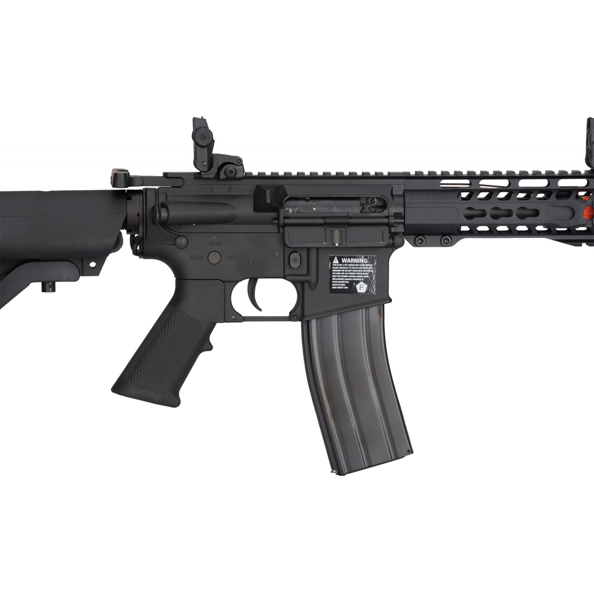 Compact and perfect for close quarters with an adjustable stock for firing at a distance, The Valken Alloy Series Carbine AEG Rifle has upgraded internals and externals that're more than what you'd expect when looking for an intermediate class AEG. Built with a reinforced high quality aluminum alloy and smooth matte finish, this 7-inch free-float keymod handrail provides enough space to fit the accessories you need while maintaining a compact frame, making it easier to take tight corners. Attach grips, lasers, and lights onto this handrail to maximize your gameplay and overtake your opponents! For even more versatility, this series includes picatinny rail segments to fit 20mm compatible accessories. The full length top optic rail seemlessly extends to the receiver, providing plenty of space for scopes, sights and magnifiers. Honing in on targets near and far isn't an problem. This series also includes front and rear flip-up sights to easily take down closer range targets.