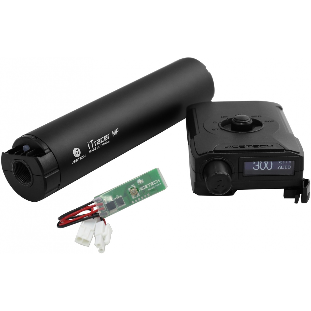 Introducing the AceTech iTracer Unit, Commander Display, and Burst MOSFET Combo in sleek black, available at Airsoft Megastore! This exceptional three-in-one set combines a tracer unit, chronograph, and intelligent MOSFET for the ultimate airsoft experience. With its high efficiency circuit and wireless digital display, you can effortlessly measure muzzle velocity, energy, and ROF. Keep track of up to 25 recordings, count your BBs, and mount the Commander Display on any standard rail for real-time readings. Crafted by renowned manufacturer LCT, known for their realistic replicas, and brought to you by Acetech, a leading airsoft accessory brand. Don't miss out on this power-saving, feature-rich combo to enhance your gameplay!