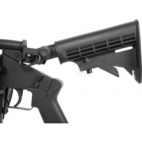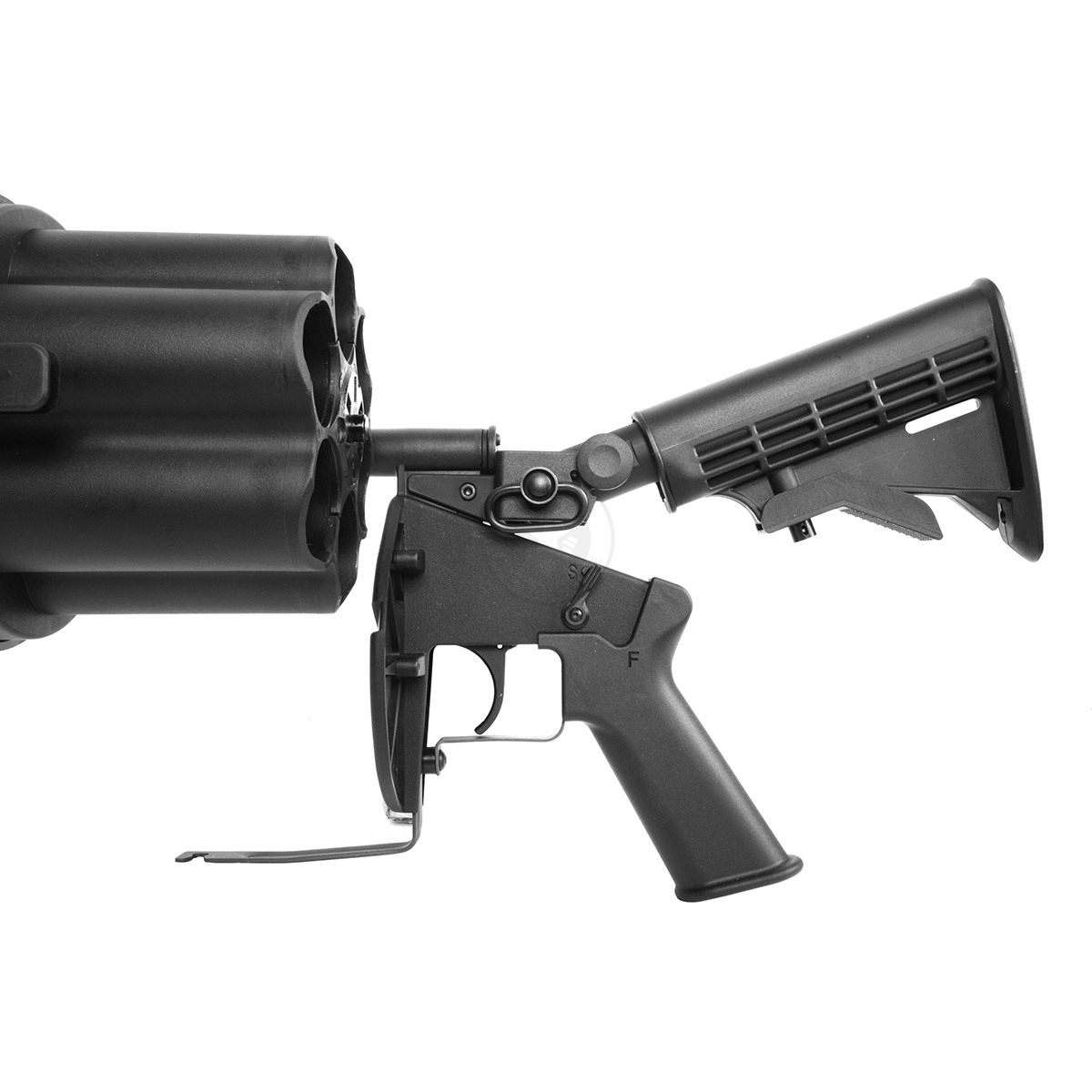 The rear stock is a tactical 6-point adjustable/retractable L.E. carbine-style stock, which is also adjustable to three different angles (for your shooting comfort) to dial in the optimal shooting position, whether you are standing, crouching, crawling, or running. Quick detach sling swivel points are also integrated onto the frame of the GLM to allow for easy sling attachment.