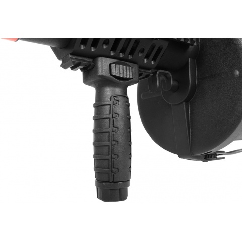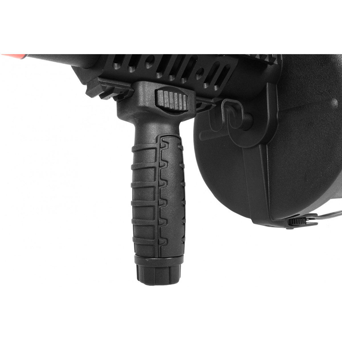The GLM also features a fully integrated rail system, which allows for easy installation of necessities such as grips, lasers, flashlights, and even has a top rail for optics (holo-sight on your grenade launcher, anybody?). A tactical ergonomic vertical foregrip is included in the package for shooting stability, and is removable should you want to replace it with a grip or other accessory of your own.