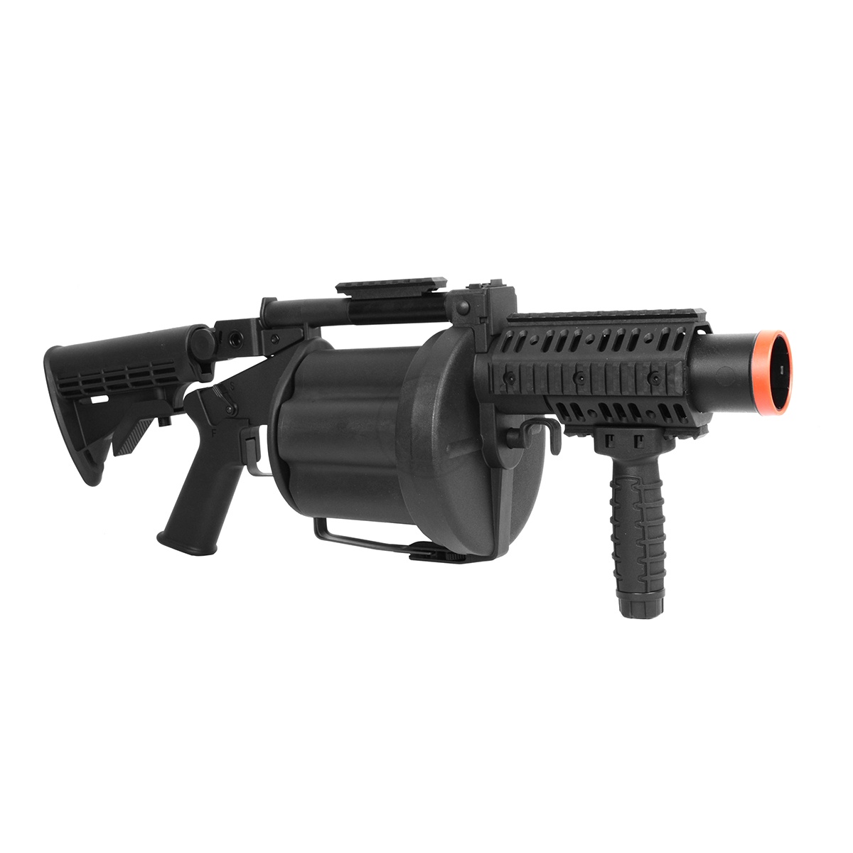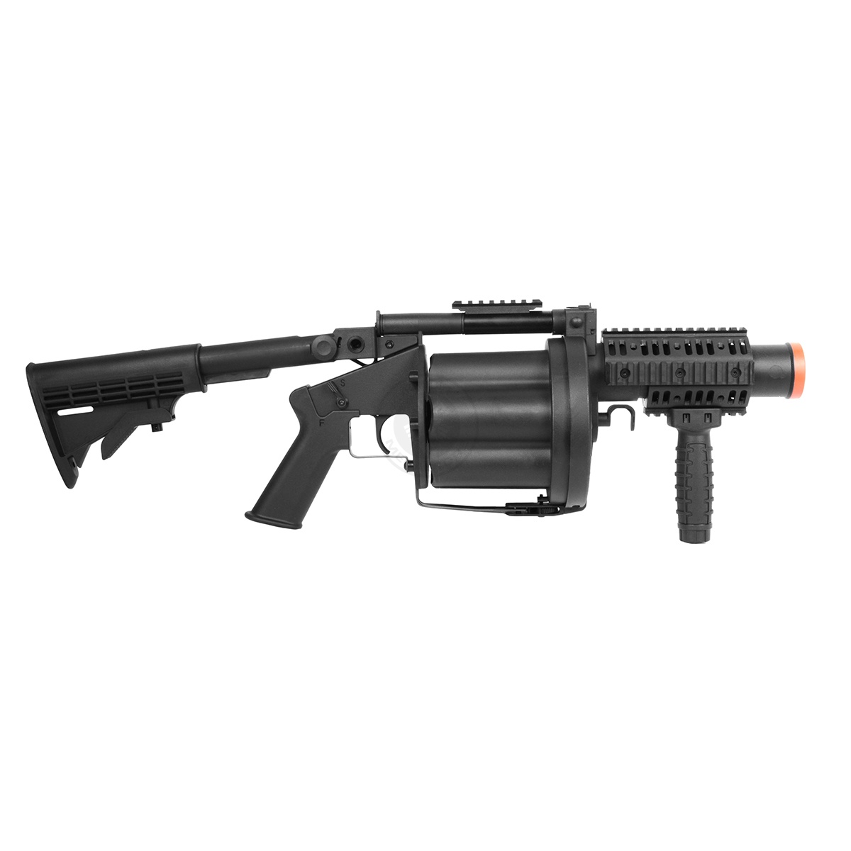 The ICS GLM full size 6-round revolving grenade launcher is a sight to behold. It is a fully-functioning grenade launcher that features an impact-resistant polymer frame, with metallic revolving chambers that can house up to 6x 40mm Airsoft grenade shells.