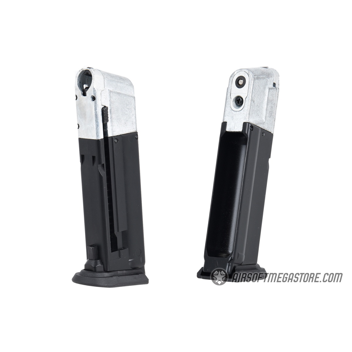• Features a CO2 compatible 8-round magazine, 20mm Picatinny RIS, and an ambidextrous slide stop lever