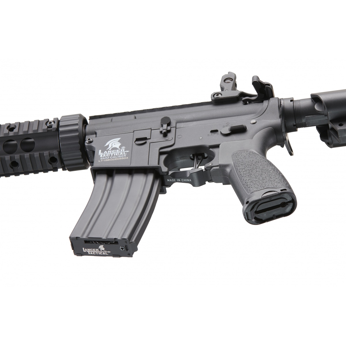 The Hybrid Difference: The Lancer Tactical Hybrid Series sports the same ProLine internals but with a key difference. Instead of a full metal body, Hybrid AEGs come with nylon polymer upper and lower receivers, making your rifle lightweight yet solid. And unlike the Lancer Tactical G2 rifles, the Hybrid series AEGs feature a full metal railed handguard. If you want the best of both worlds, Hybrid is the way to go. The 6.03mm stock tightbore barrel further increases range and FPS, and an injected polymer rotary style hop-up adjusts BB spin effortlessly for maximum precision. Upgraded with an 18:1 reinforced steel gear set to provide a quicker cycling rate and 8mm bushings to enhance the operational smoothness of your gears. These upgraded internals increase shot to shot consistency with minimal wear to your internals. The powerful 25k high torque motor is regulated to maximum efficiency with low resistance copper wiring and a bonus battery protection feature! When low voltage is detected from a drained battery, an automatic cut off keeps equipped batteries from draining completely, vastly increasing battery life and longevity. Replace your springs and alter your FPS without opening up your gearbox! A true quick change spring system enables adjustment from CQB to outdoor and back through unlocking the mechanism secured inside the buffer tube.