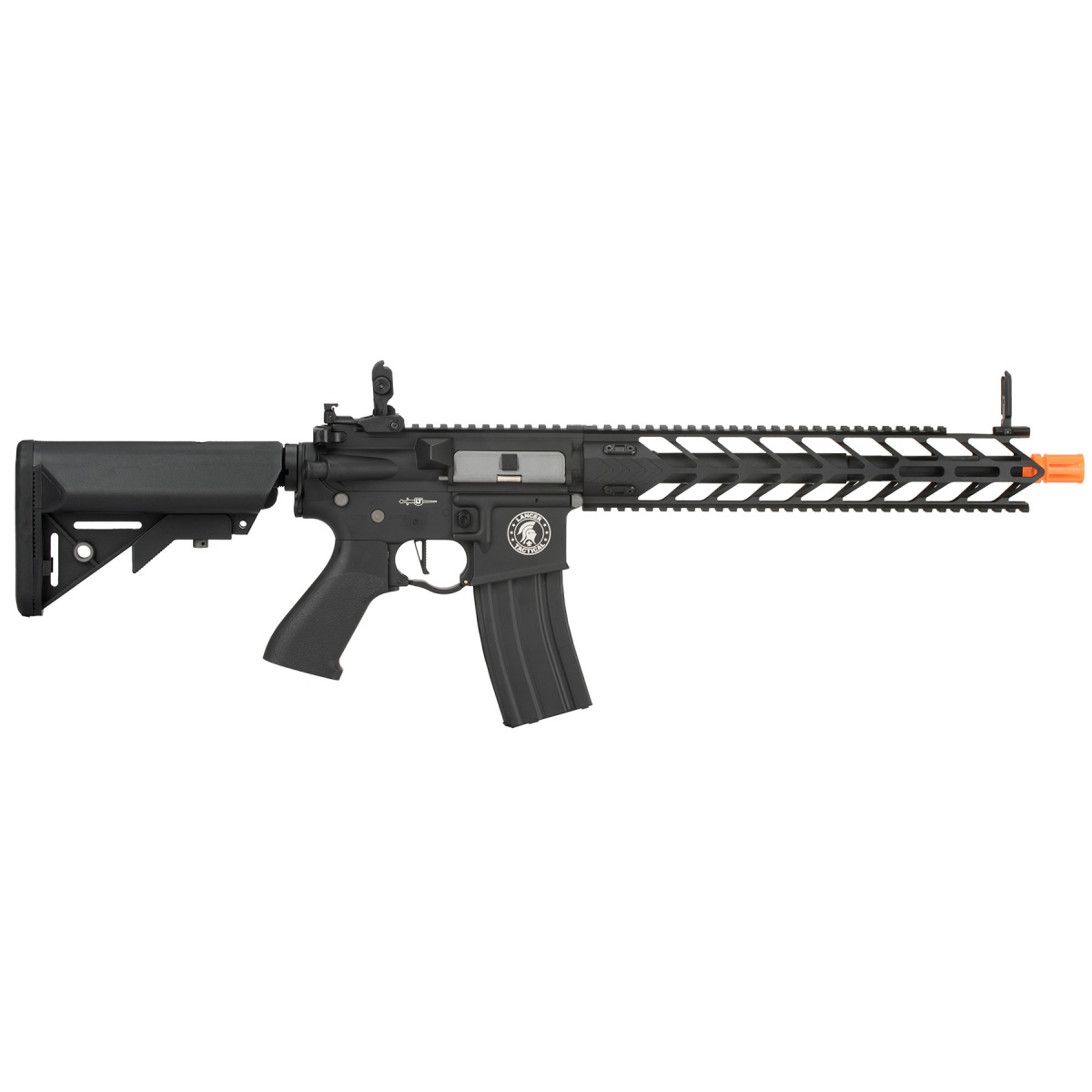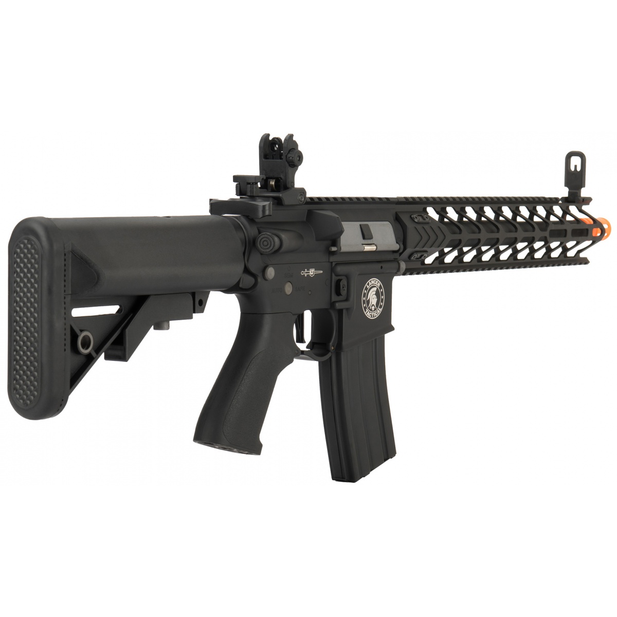 Upgraded Gearbox/Internals: The 6.03 stock tightbore barrel further increases range and FPS, and an injected polymer rotary style hop-up adjusts BB spin effortlessly for maximum precision. Upgraded with an 18:1 reinforced steel gear set to provide a quicker cycling rate and 8mm bushings to enhance the operational smoothness of your gears. These upgraded internals increase shot to shot consistency with minimal wear to your internals. The powerful 25k high torque motor is regulated to maximum efficiency with low resistance copper wiring and a bonus battery protection feature! When low voltage is detected from a drained battery, an automatic cut off keeps equipped batteries from draining completely, vastly increasing battery life and longevity. Replace your springs and alter your FPS without opening up your gearbox! A true quick change spring system enables adjustment from CQB to outdoor and back through unlocking the mechanism secured inside the buffer tube.