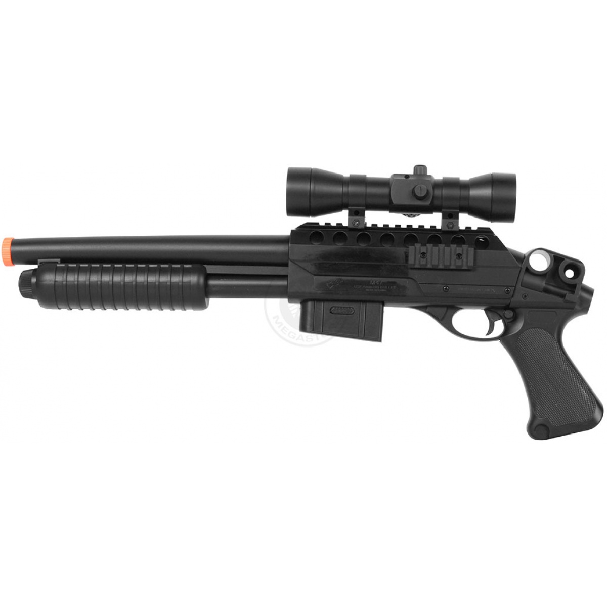 This Tactical Pistol Grip airsoft shotgun by Double Eagle features an Compact design and a full top rail, perfect for mounting the included accessory scope or additional accessories such as flashlights and lasers! The tactical and compact pistol grip makes this airsoft shotgun perfect for close quarters combat, and its compact barrel length and lightweight design makes it easy and comfortable to carry as a secondary airsoft weapon. This shotgun shoots hard at over 300 FPS and pierces even the thickest cardboard. This is an awesome shotgun for airsoft players and backyard target shooters alike! Extremely versatile, it does not weigh you down when you are on the move. A must-buy to add to the collection, and at this price, it's also a tremendous value airsoft shotgun.