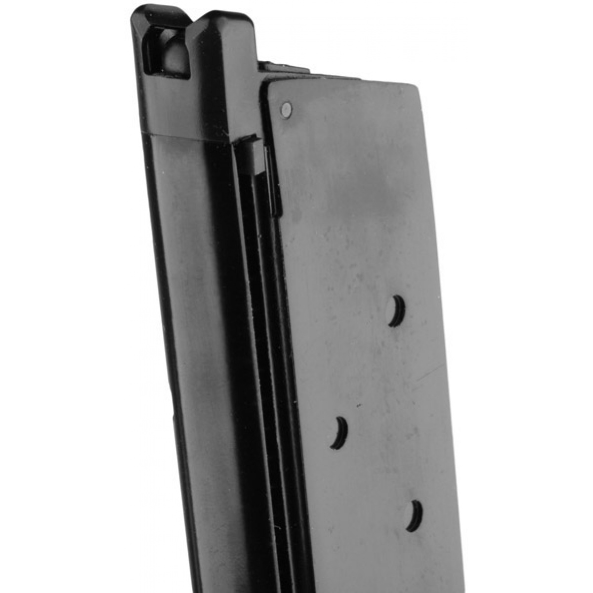 This is a factory original single stack, 15 round capacity magazine for 1911, M1911, and MEU WE gas blowback pistols. This magazine is constructed entirely out of metal, and has a flat black finish. This single stack gas magazine is easy to load, with an opening on the front of the magazine for loading BB's. This magazine is light weight and durable, and is compatible with all WE 1911's that use a single stack (slim) magazine.