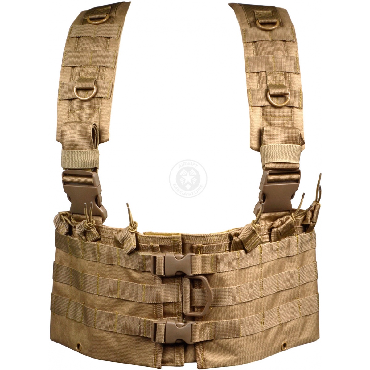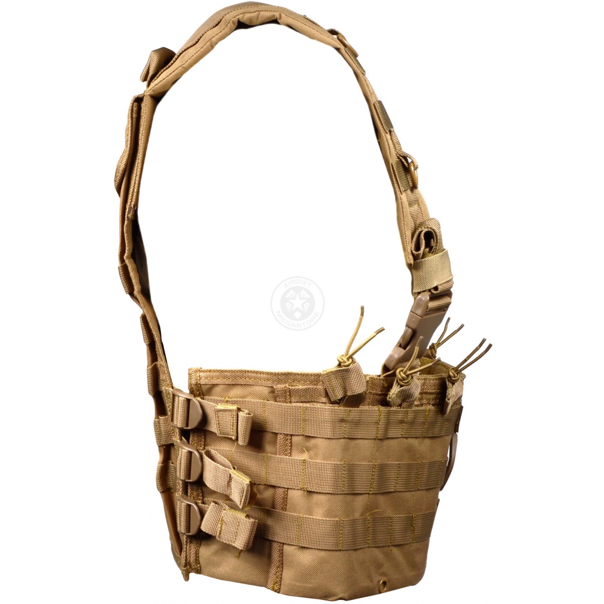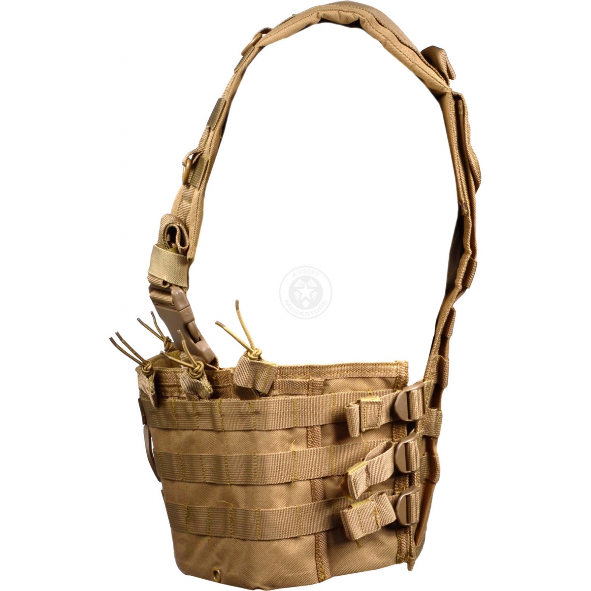 This highly customizable NcStar Chest Rig features heavy duty quick release plastic buckles, and durable D-Rings for attaching accessories or slings. The stitching quality on this chest rig is excellent, and is sure to hold up to the most intense airsoft combat. This chest rig also features bungee magazine retention straps for easy access while reloading. Customize this chest rig to fit your style of play perfectly with MOLLE pouches/accessories. This NcStar Chest Rig is ideal for the Airsoft player looking for a modular chest rig that is both lightweight, and capable of carrying plenty of ammo and equipment. If you are the type of player who values mobility, but doesn't want to sacrifice the amount of ammo they can carry, this is definitely the chest rig for you!