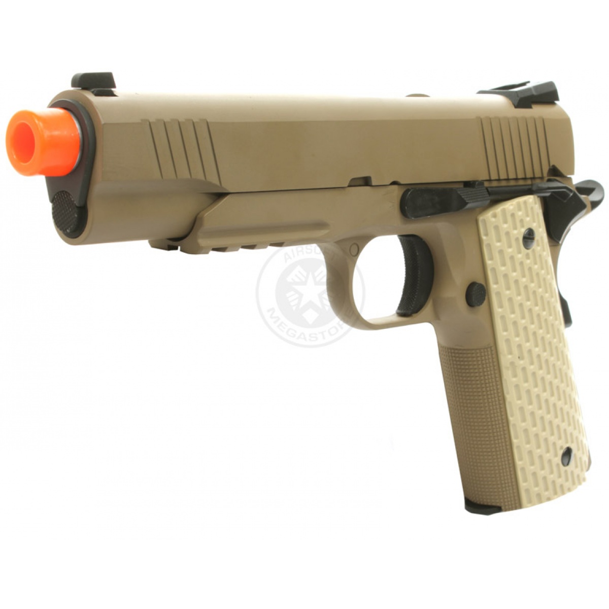 The New Enhanced full metal WE Desert Warrior Full Size M1911 gas blowback pistol has been upgraded to increase gas efficiency and provide consistent power behind every shot. This tactical Desert Warrior M1911 comes in an amazing desert tan finish and is one of the BEST looking M1911 gas blowback pistols currently available.