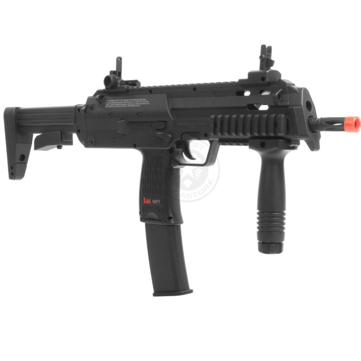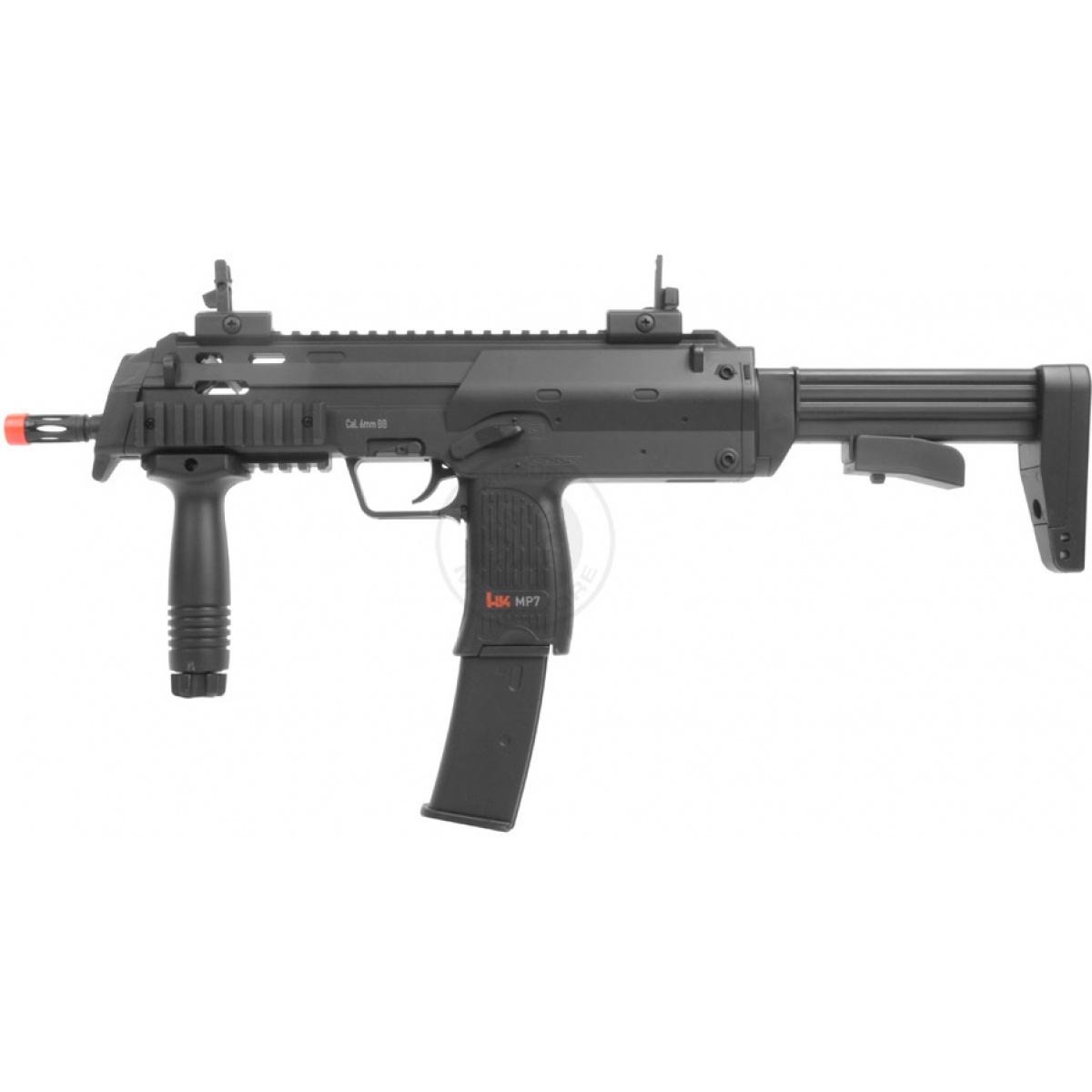 Utilizing a powerful (240 FPS w/ 0.12g BB's) reinforced polymer gearbox and precision metal inner barrel, the Umarex HK MP7 AEG is capable of hitting targets at 100 feet and has a high rate of fire (over 12 rounds per second). Unlike most other MP7 AEGs on the market, this HK MP7 AEG comes with a 180rd high capacity magazine ensuring that you don't run out of ammo on the airsoft field.