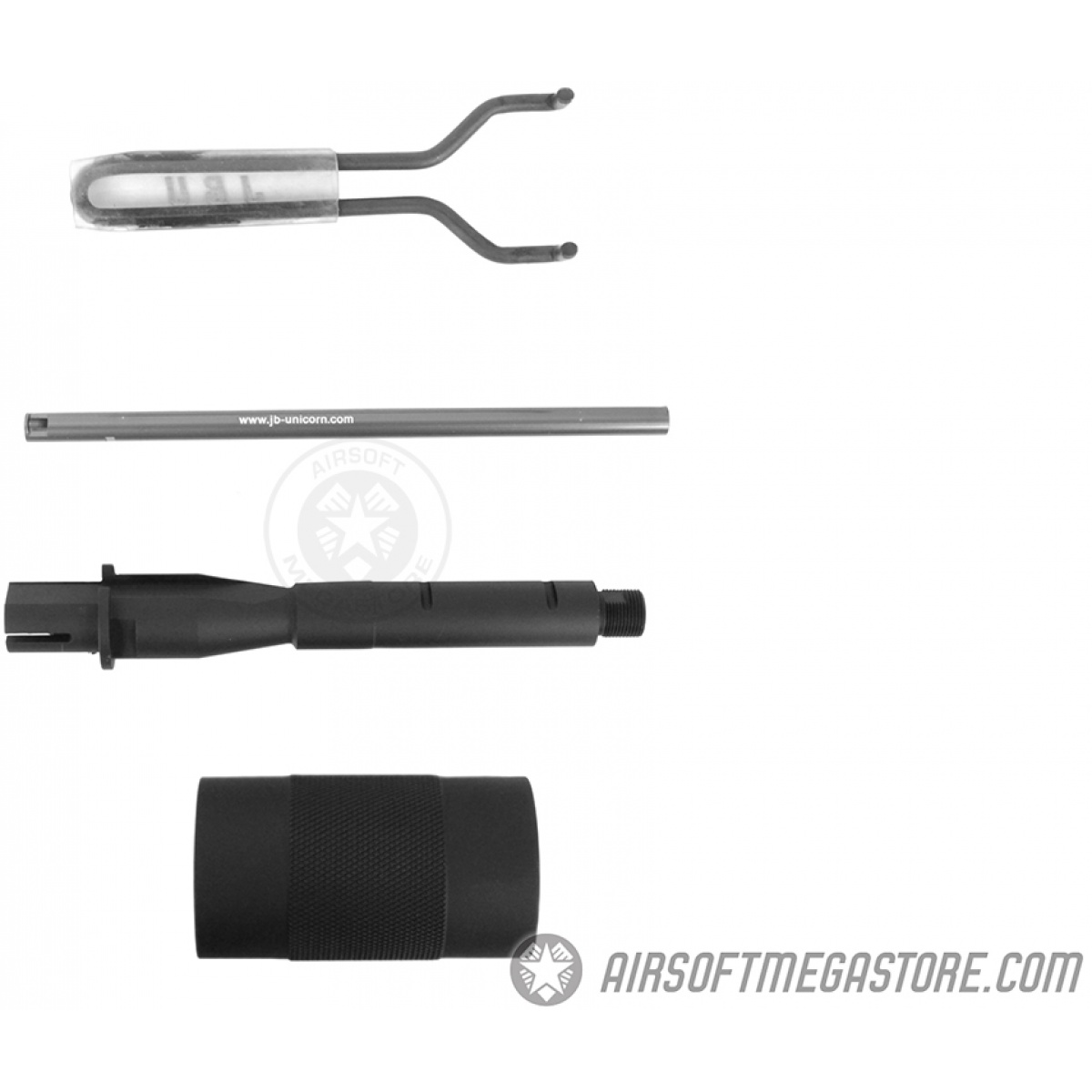 Additionally, this conversion kit includes a reinforced outer barrel that runs 6.5 inches long and a high precision inner barrel with an internal diameter of 6.03 millimeters, making shooting more accurate and at higher FPS. Because this handguard replaces the standard delta ring assembly, it is compatible with most metal gearbox M4 AEGs. JBU's Tubular Free-Floating Handguard Conversion Kit is perfect for any airsoft player looking to convert a standard length M4 AEG into a shorty CQB rifle, while maintaining a modern look and modular capabilities. All necessary components for installation are included, such as a CNC-machined barrel nut and tightening tool; however, professional installation may be required.