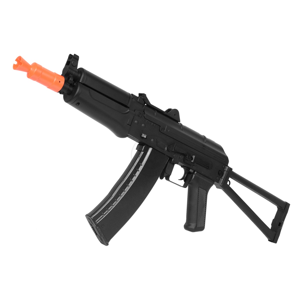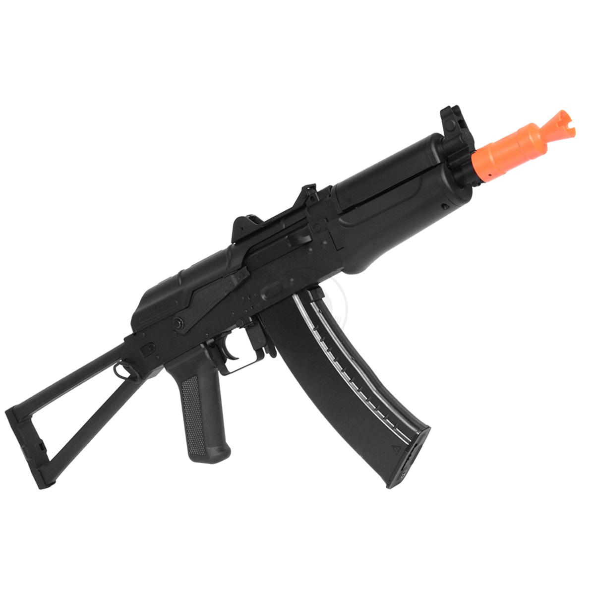 From the handguard to the stock, this AEG is built with impact resistant ABS polymer, making it extremely lightweight, and comes with a fully retractable skeleton stock for enhanced CQB play (and easy storage). It’s perfectly tailored for fast-paced players without the added weight of a full-sized AEG. Corner tight spaces, clear out buildings and quickly maneuver in any field knowing this AK-74U can easily keep up with most other AEGs outside its price range. Firing in full and semi-automatic modes, this AK-74U delivers respectable FPS behind every shot and costs only a fraction of the price of other similar AEGs on the market. For a more modern look, this AK AEG comes in smooth black finish and is equipped with the distinct AK-74U flash hider. It also includes front/rear iron sights and universal sling mount.