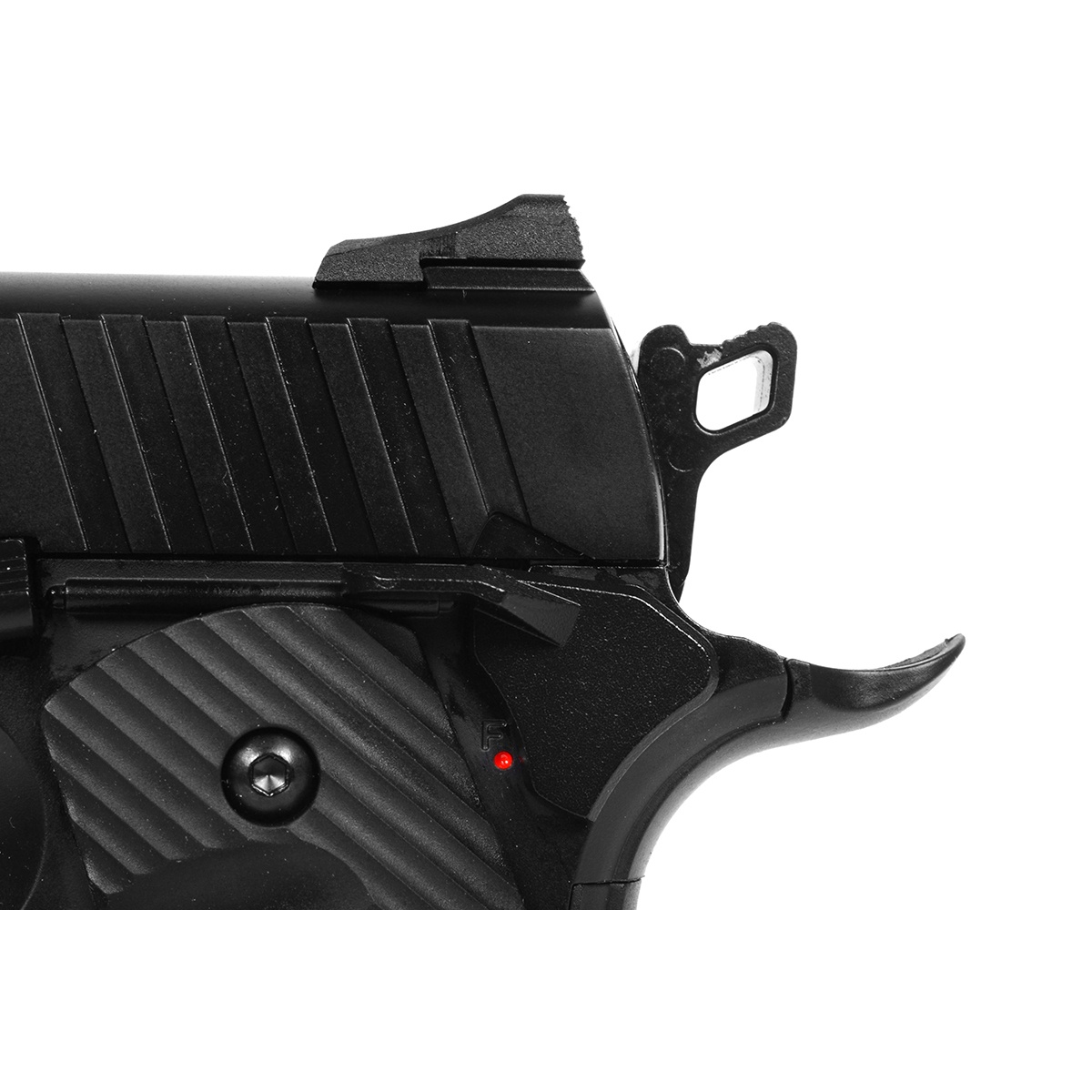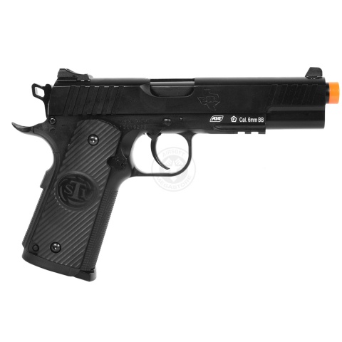 Modeled off a government size frame, this licensed Duty One series pistol measures 9 inches long and features STI's innovative Picatinny rail system, which can accept most industry flashlights and laser units. This blowback pistol is built using standard 1911 specs but also includes a commander style hammer, separating this model from most older M1911 pistols on the market. Coupled with its checkered pistol grip and high-rise beavertail safety grip, which prevents slide bite, the Duty One replica provides excellent hold and is a fine choice that keeps ergonomics in mind — and shooting well into 400-FPS territory helps as well. This designates it as an exceptional pistol for law enforcement training scenarios as it will also fit into standard M1911 holsters and comes integrated with fixed iron sights.