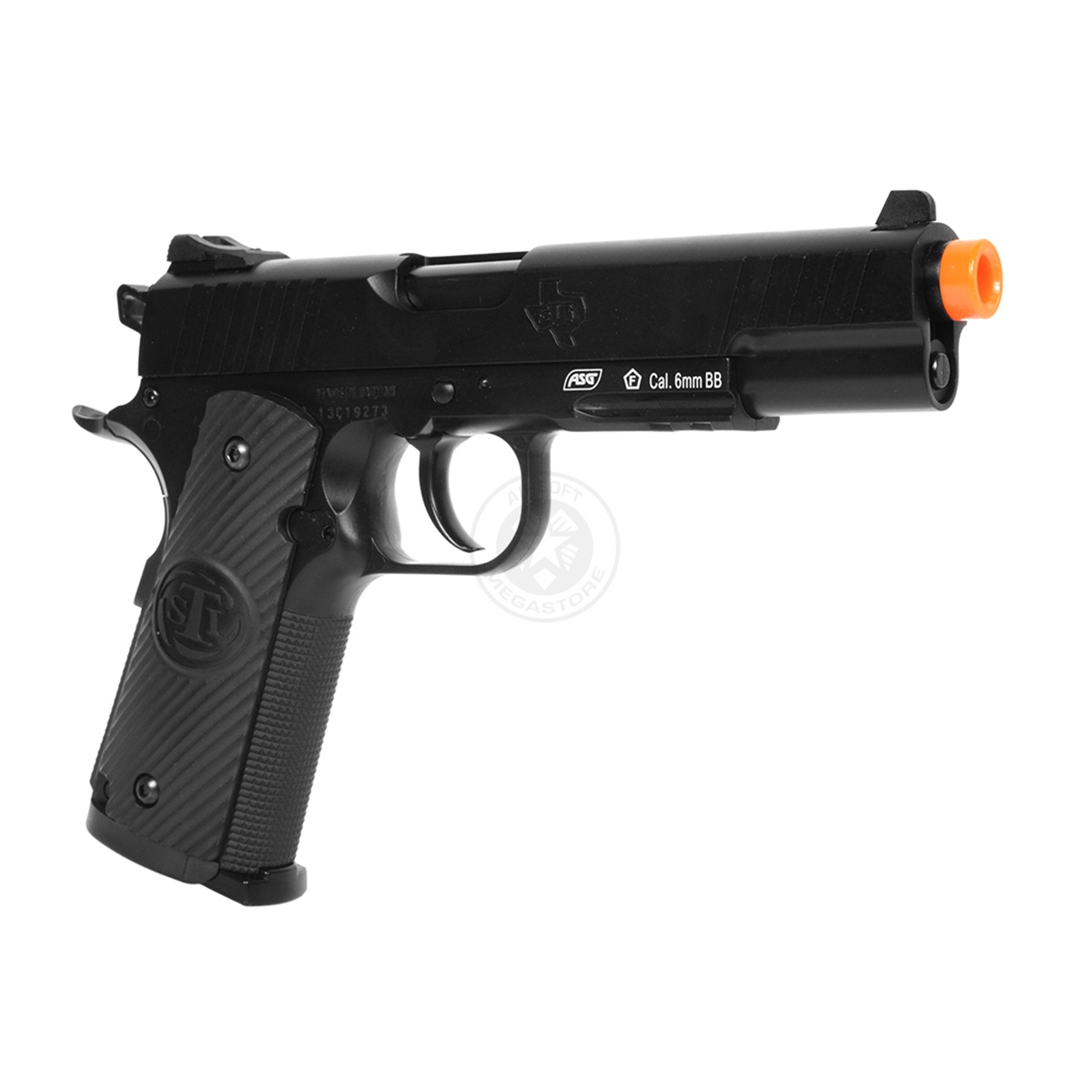 The Duty One CO2 pistol by ASG is engraved with STI International's official trademarks and unique serial number etched onto the full metal slide, adding a final touch of authenticity. The frame is constructed out of nylon polymer, which not only helps reduce weight but makes it extremely durable. Single sided thumb safety and an easy-open CO2 compartment only adds onto the list of what qualifies this licensed model to be a must-have. Anyone looking into picking up a reliable blowback pistol with real steel licensing and hard-hitting specs will find the STI Duty One 1911 CO2 pistol to be perfect.