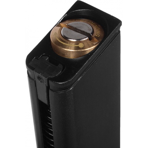 The APS Action Combat Pistol (ACP) 23rd CO2 Magazine has a full metal construction and holds up to 23 rounds. The revolutionary new CO2 loading system allows for the magazine to be filled up by the CO2 rather than having all of the pressure on the valves and seals of the magazine and pistol.