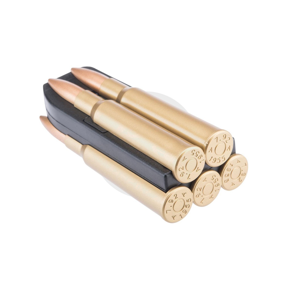 Introducing the ARES 20 Round Mid-Cap Magazine for Kar 98k Spring Powered Airsoft Rifles. Crafted from heavy-duty polymer, it ensures durability and reliability on the field. Featuring faux bullets for a realistic appearance and a lightweight design, it's perfect for skirmishes. With a high-quality spring, expect consistent and reliable feeding. Compatible with ARES Karabiner 98k Series and other compatible spring-powered rifles, it's a must-have accessory for any airsoft enthusiast. Upgrade your loadout with this black magazine, designed for convenience and performance. Dominate the battlefield with precision and confidence using this essential accessory.