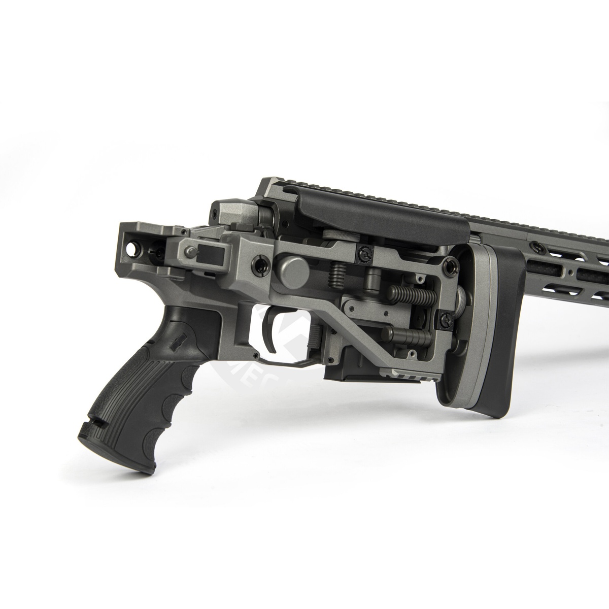 The ARES MSR303 Quick-Takedown Airsoft Sniper Rifle is a premium precision platform designed for serious marksmen who demand accuracy, versatility, and durability in one package. Built on the proven ARES Striker spring-powered system, this sniper rifle delivers consistent 400 FPS performance, making it ideal for long-range engagements in competitive airsoft matches. The rifle features a CNC aluminum upper receiver and handguard with modular rail sections, giving players the flexibility to mount optics, bipods, or other accessories. Its carbon fiber outer barrel not only reduces weight but also adds strength and a professional finish. The quick-takedown system allows every part of the rifle to be assembled or disassembled without tools, making transport and maintenance exceptionally easy.