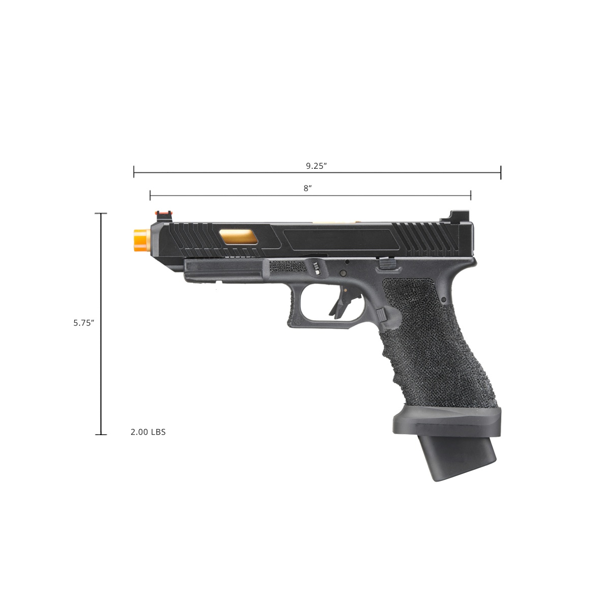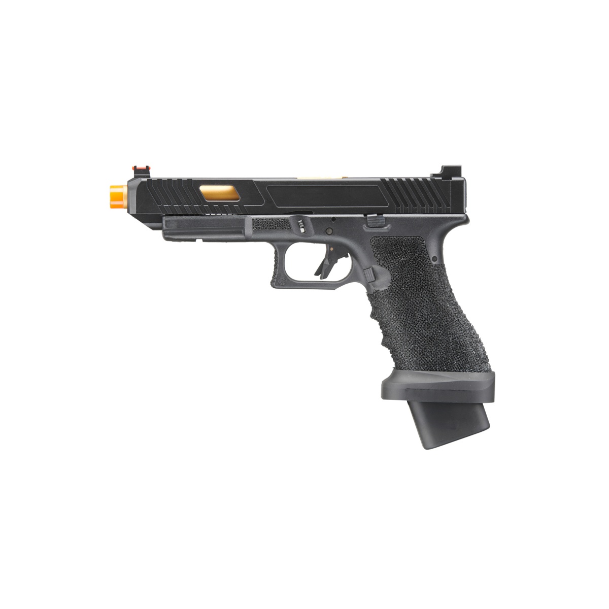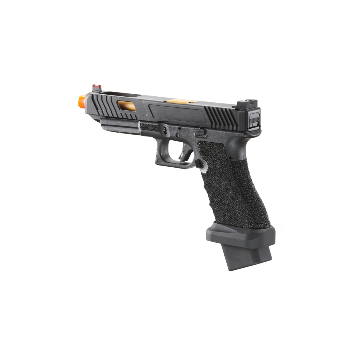 The Army Armament R34-1 Gas Blowback Airsoft Pistol in tan and black is a reliable sidearm built for players who want a durable, realistic, and high performance pistol for their loadout. Constructed with a full metal slide paired with a reinforced polymer frame, the R34-1 balances strength and weight to create a sidearm that feels authentic without being cumbersome. Powered by green gas, it delivers consistent performance with a muzzle velocity of 320 to 350 FPS using 0.20g BBs, making it suitable for both outdoor play and close quarters skirmishes. With a 28 round magazine, players can depend on extended shooting capability, while the adjustable hop up ensures accuracy and range can be fine tuned to match different field conditions. The two tone tan and black color scheme also provides a modern tactical aesthetic that pairs well with a variety of gear setups. Beyond its strong foundation, this gas blowback pistol features enhancements that elevate handling and realism. The slide cycles back with each shot, providing an authentic recoil effect that mirrors real firearm operation. Rear slide serrations allow for easy racking, while the textured grip ensures comfort and control even during fast paced gameplay or when wearing gloves. A trigger safety is integrated directly into the design for extra protection, while an enhanced thumb rest improves ergonomics and handling. With its balance of realism, performance, and durability, the Army Armament R34-1 Gas Blowback Airsoft Pistol is an excellent choice for players who want a dependable sidearm that combines authentic functionality with field ready performance. Whether you are looking for a backup weapon for competitive matches or a reliable sidearm for training and MilSim, this pistol delivers the power and realism needed to stay competitive on the field.
