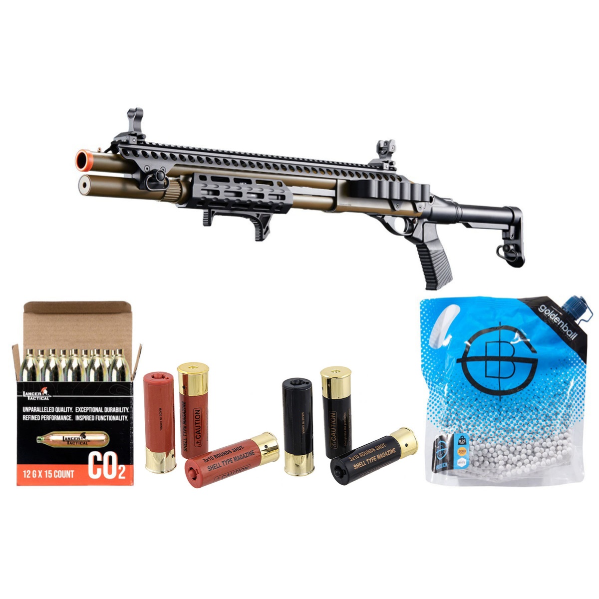 Golden Eagle M8875 3/6-Shot Pump Action CO2 Airsoft Shotgun w/ Flip Up Sights, M-LOK, Picatinny Rail & M4 Buffer Stock - Shell/CO2 Combo - (Tan)