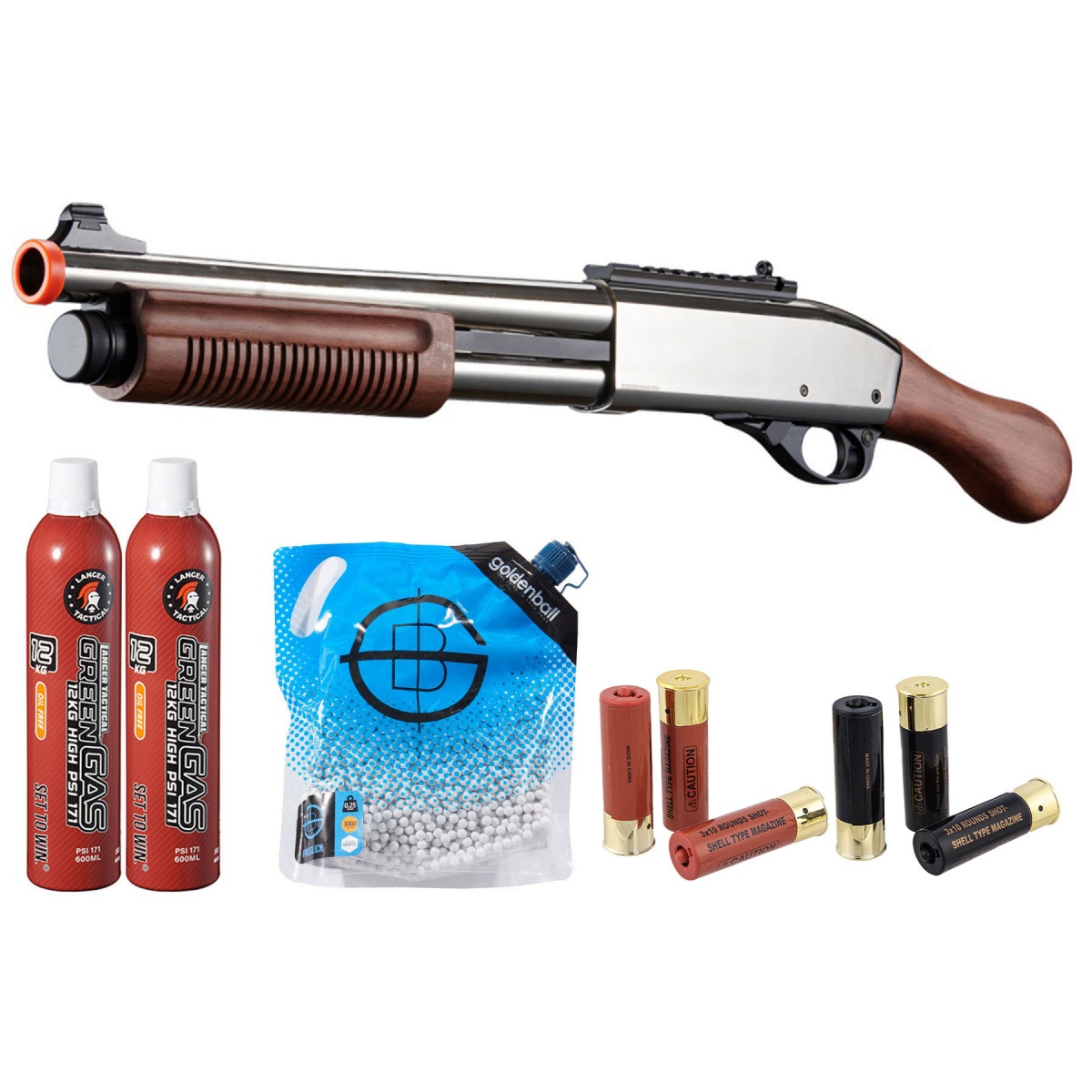 This exclusive combo delivers unbeatable value by bundling high demand accessories into one ready to sell package. Included are six Golden Eagle 30 round shotgun shells built from lightweight polymer with high tension springs for smooth and reliable feeding, ensuring consistent triple shot performance. The set also features a can of Lancer Tactical 12KG High PSI Green Gas to extend the life of the shotgun's internals. To complete the loadout, the package includes 3000 rounds of Golden Ball 0.25g ProSlick Seamless BBs, offering exceptional polish and precision for maximum range and accuracy. For airsoft dealers, this complete bundle delivers huge savings, fast turnover potential, and strong retail appeal with its authentic design and performance focused components, making it a top selling option for customers seeking a premium gas powered shotgun setup.
