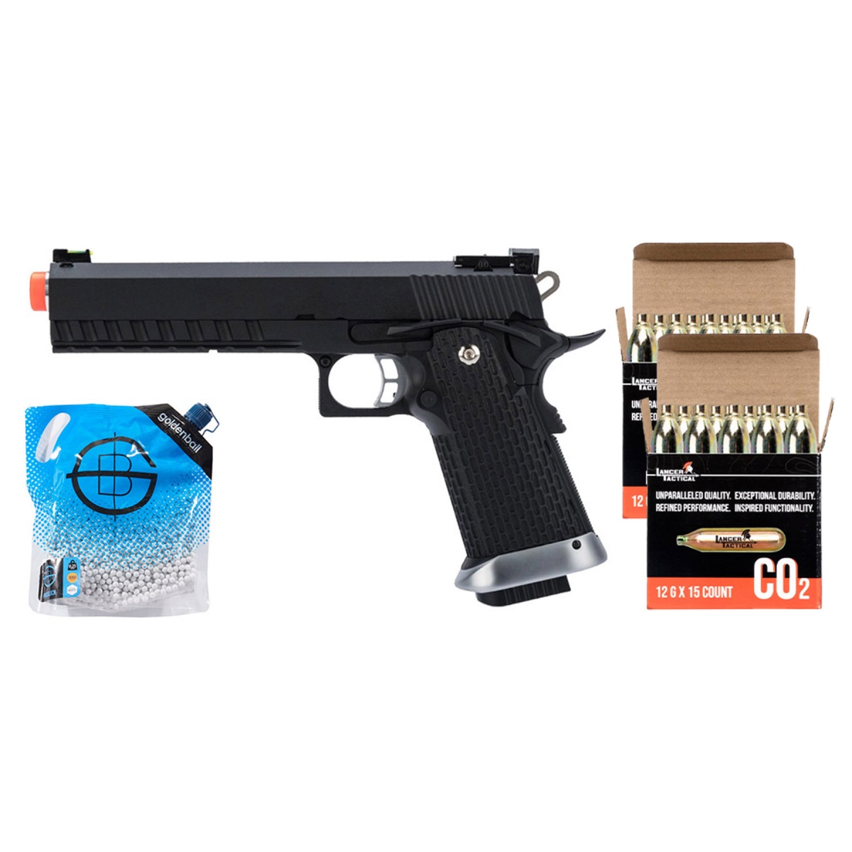 The KJW Xcelerator 6 inch Hi-CAPA CO2 Gas Blowback Airsoft Pistol - CO2 Combo is a competition ready sidearm designed for speed, precision, and power. Built with a full metal slide and contoured frame, it offers a realistic weight and feel along with excellent durability. The integral rail allows for mounting tactical lights or other accessories, while the silver metal enlarged speed reload magwell and bull barrel enhance reload speed and shooting stability. The pistol delivers enhanced hard kick recoil blowback action for an immersive shooting experience, and its extended metal competition slide stop improves handling during rapid play. An adjustable high visibility fiber optic front sight ensures fast target acquisition, complemented by ambidextrous safety controls. The skeletonized contoured hammer, smooth two hole trigger, and rubberized high texture grip with beaver tail safety all contribute to comfortable, responsive handling in any scenario. This exclusive dealer bundle combines the Xcelerator 6 inch Hi-CAPA with premium accessories to create a complete, ready to play package that delivers huge savings compared to buying items separately. The included Lancer Tactical High Pressure 12 Gram CO2 Cartridges (15 pack) are precision manufactured for consistent performance, ensuring the pistol operates at peak power every time. Also included are Golden Ball 3000 Round 0.25g ProSlick Seamless BBs, engineered for smooth feeding, tight groupings, and reliable accuracy in any 6mm platform. By offering a high performance CO2 blowback pistol alongside professional grade ammunition and high quality CO2 cartridges, this bundle is perfectly suited for players searching for airsoft pistol bundles, CO2 competition packages, and exclusive discount deals. For retailers, it is a high demand, high margin product that drives online traffic and in store sales by providing customers with a complete, competition ready sidearm kit built for both performance and value.