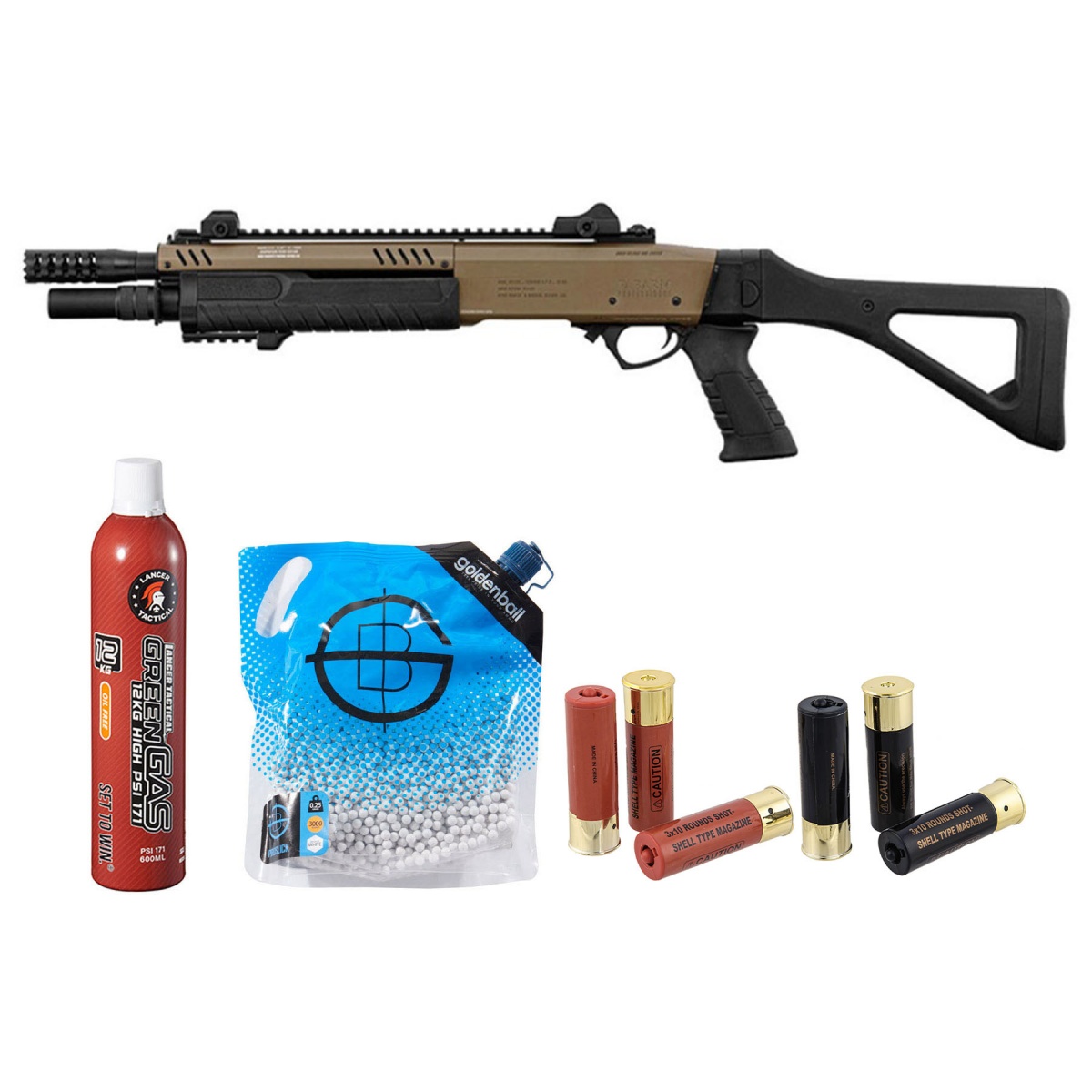 The Fabarm 33" Compact Gas Pump Shotgun Replica - Green Gas/Shell Combo - (Tan) is a premium, officially licensed airsoft shotgun designed for durability, performance, and realism. Built with a full metal body and strong polymer barrel assembly, this model features a protective Cerakote finish and an aggressively styled muzzle brake for a bold, tactical look. Its gas-powered tri-shot spread system delivers realistic performance with every pump, while the ergonomic pistol grip and triangular stock ensure comfort and stability during extended use. The fore-end includes a 20mm Picatinny under rail for easy accessory attachment, and the removable rail with a quick release pivot system allows for fast customization. Integrated sights are built into the carcass for streamlined target acquisition, making this shotgun ideal for both close-quarters battles and tactical scenarios. This ready-to-sell bundle offers maximum value to both dealers and players by including essential accessories for immediate gameplay. The set comes with 3000 rounds of Golden Ball 0.25g ProSlick Seamless BBs, engineered for superior accuracy, consistent feeding, and minimal jamming. A 6-pack of Golden Eagle Airsoft Shotgun Shells is also included, each holding 30 rounds and featuring a high-tension spring for flawless performance in triple-shot systems. For reliable power, the bundle provides Lancer Tactical 12KG High PSI Green Gas with added silicone for lubrication and maintenance, paired with a durable metal nozzle for leak prevention. By packaging a high-demand, officially licensed Fabarm shotgun with premium ammo, extra shells, and quality green gas, this combo delivers significant savings compared to individual purchases. Ideal for in-store promotions, online product listings, and seasonal sales, this bundle boosts customer appeal, drives traffic, and increases dealer profit margins by offering a complete, game-ready airsoft solution in a single SKU.