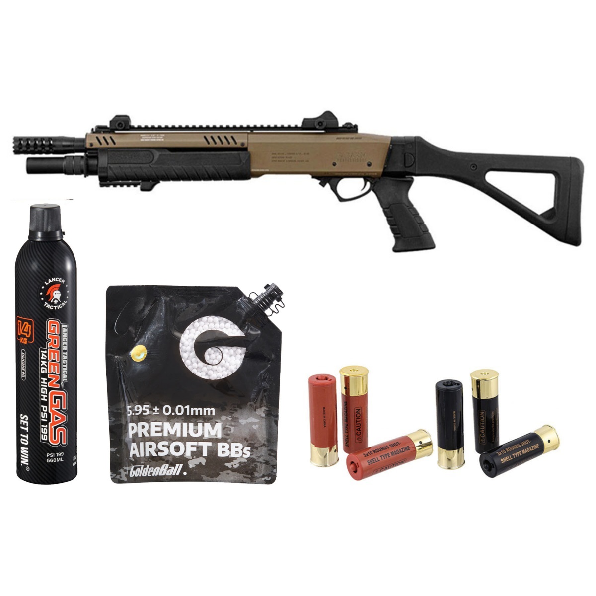The Fabarm 33" Compact Gas Pump Shotgun Replica - Green Gas/Shell Combo - (Tan) is a premium, officially licensed airsoft shotgun designed for durability, performance, and realism. Built with a full metal body and strong polymer barrel assembly, this model features a protective Cerakote finish and an aggressively styled muzzle brake for a bold, tactical look. Its gas-powered tri-shot spread system delivers realistic performance with every pump, while the ergonomic pistol grip and triangular stock ensure comfort and stability during extended use. The fore-end includes a 20mm Picatinny under rail for easy accessory attachment, and the removable rail with a quick release pivot system allows for fast customization. Integrated sights are built into the carcass for streamlined target acquisition, making this shotgun ideal for both close-quarters battles and tactical scenarios. This ready-to-sell bundle offers maximum value to both dealers and players by including essential accessories for immediate gameplay. The set comes with 3000 rounds of Golden Ball 0.25g ProSlick Seamless BBs, engineered for superior accuracy, consistent feeding, and minimal jamming. A 6-pack of Golden Eagle Airsoft Shotgun Shells is also included, each holding 30 rounds and featuring a high-tension spring for flawless performance in triple-shot systems. For reliable power, the bundle provides Lancer Tactical 12KG High PSI Green Gas with added silicone for lubrication and maintenance, paired with a durable metal nozzle for leak prevention. By packaging a high-demand, officially licensed Fabarm shotgun with premium ammo, extra shells, and quality green gas, this combo delivers significant savings compared to individual purchases. Ideal for in-store promotions, online product listings, and seasonal sales, this bundle boosts customer appeal, drives traffic, and increases dealer profit margins by offering a complete, game-ready airsoft solution in a single SKU.