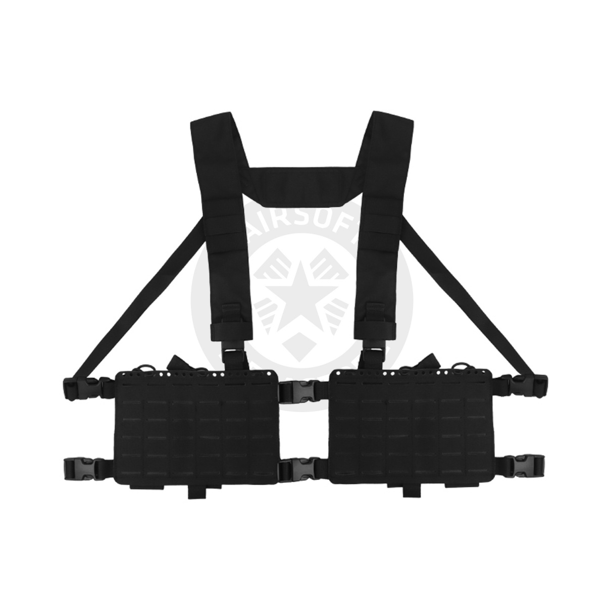 Introducing the Tactical Alpha Chest Rig by Code 11 Gear. Versatile design with molle compatibility, split chest rig, and secure elastic pouches. Perfect for tactical gear organization in intense airsoft battles.
