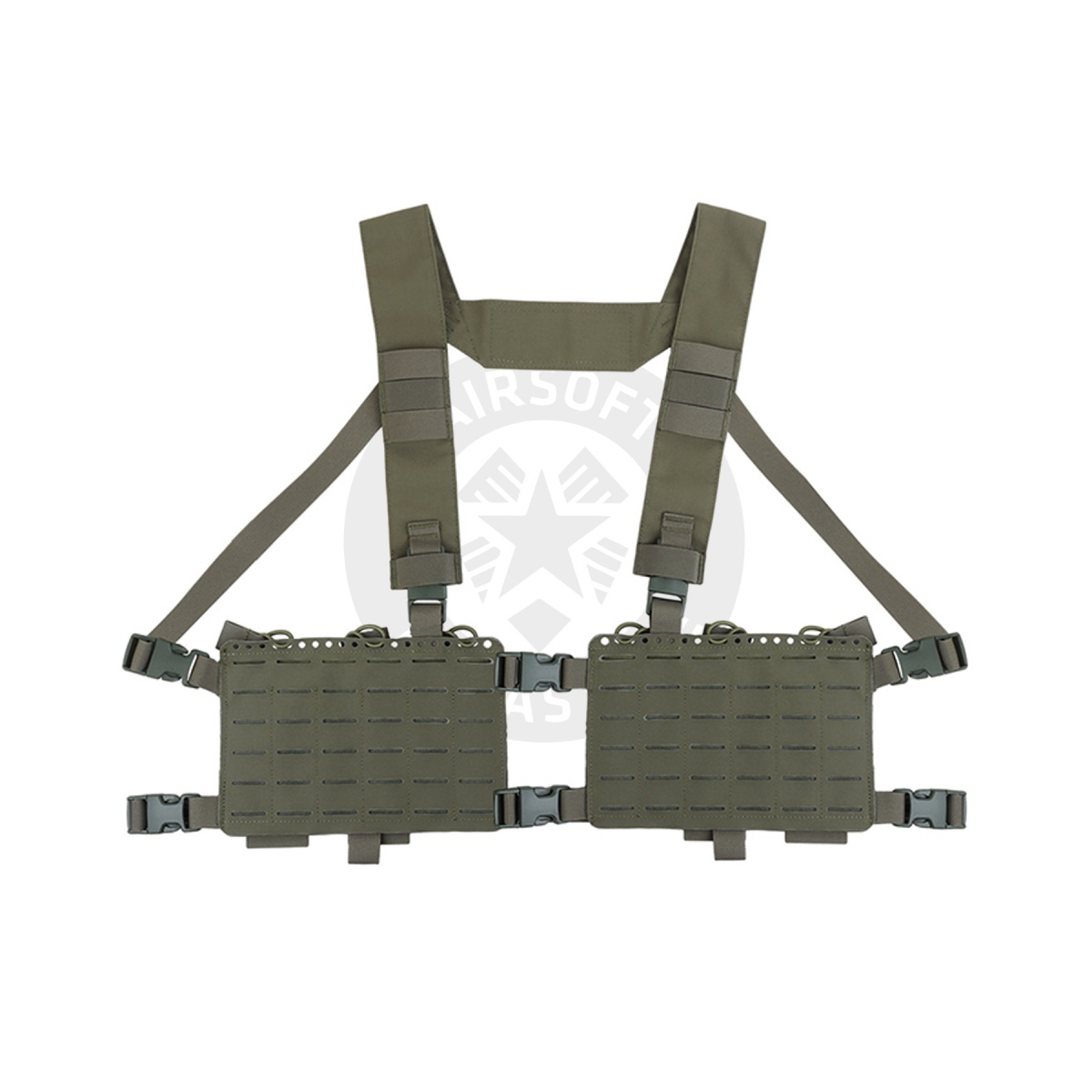Introducing the Tactical Alpha Chest Rig by Code 11 Gear. Versatile design with molle compatibility, split chest rig, and secure elastic pouches. Perfect for tactical gear organization in intense airsoft battles.