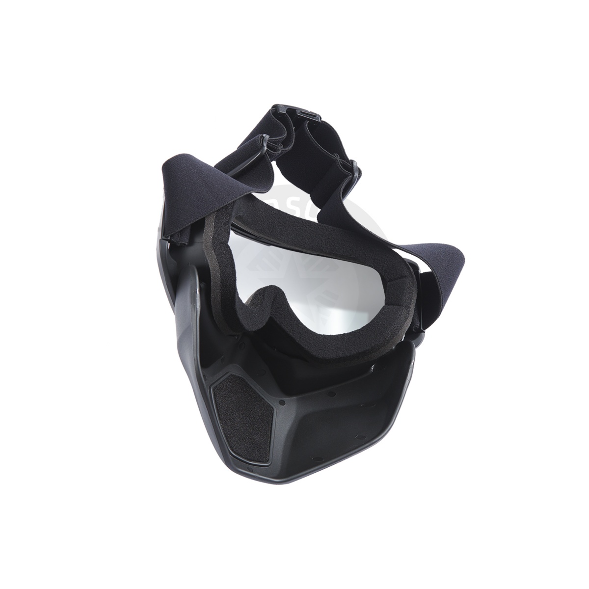 This Face Mask w/ Clear Lens Eye Protection in black offers tough TPU plastic construction, adjustable sizing, and a breathable vented mouthpiece for comfort. With non-obstructed eyepiece, it ensures clear vision and safety. Lightweight and compact, it's perfect for airsoft battles.