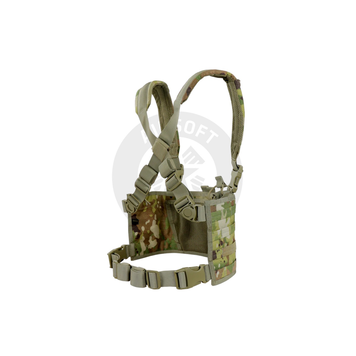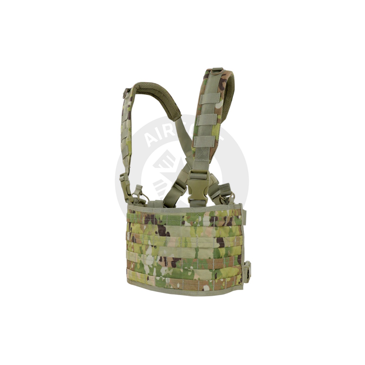 Introducing the Condor Outdoor Scorpion OPS Chest Rig, available at Airsoft Megastore. This versatile chest rig features genuine Scorpion OCP for enhanced durability and performance. The padded cross-back shoulder strap with webbing and D-rings ensures comfort during extended use. Equipped with Swivi-Lockster swivel quick release buckles and extensive MOLLE webbing, it allows for modular attachments and customization. The front pocket with hook and loop panel, two open top utility pockets with elastic cords, and an interior mesh pocket provide ample storage space. Designed with grommets for drainage and an adjustable waist fitting from 28"-56", this chest rig is perfect for serious airsoft enthusiasts seeking reliability and functionality.