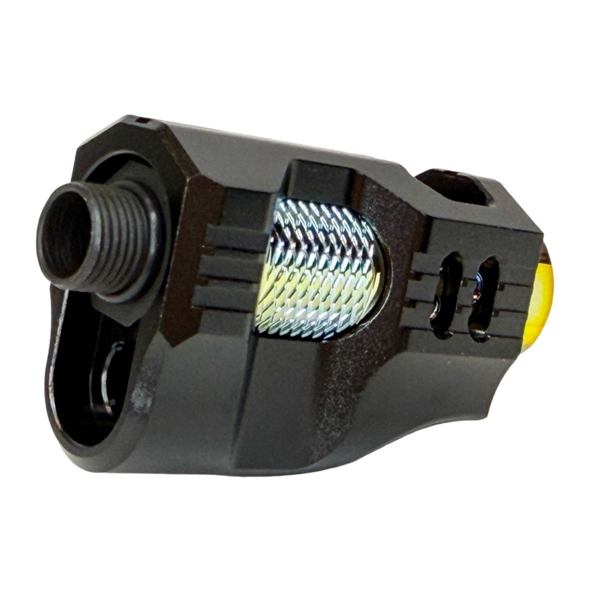 The CTM CNC Hi-Capa Compensator with 11mm to 14mm CCW Adapter is a precision upgrade designed to enhance both the performance flexibility and visual impact of any Hi-Capa airsoft pistol. CNC machined from high strength 6061 aluminum and reinforced with steel components, this compensator delivers a durable yet lightweight solution for players looking to refine their build. Its four sided ported design draws inspiration from real firearm compensators, giving your setup a more aggressive and competition ready appearance. Engineered specifically for Hi-Capa platforms, it features a unique mounting system that integrates seamlessly with adapter threaded outer barrels. The included stainless steel adapter expands compatibility by converting 11mm threads to 14mm CCW, allowing for broader integration with suppressors, tracer units, or other muzzle accessories. It also provides the ability to conceal extended inner barrels within the compensator, maintaining a clean and streamlined profile.