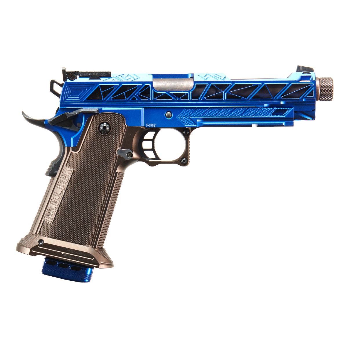 This custom Vidar build elevates the platform even further with premium aftermarket upgrades designed for durability, reduced weight, and aggressive aesthetics. The Dr. Black Type 800 aluminum slide introduces precision machining with weight reducing cutouts, enhancing cycling speed while maintaining structural strength. Complementing the slide is the Dr. Black CNC aluminum Type 07 frame, providing a rigid foundation along with a tactical rail capable of supporting most weapon lights or accessories. The Dr. Black Type B aluminum grip incorporates a cutout design that reduces weight while maintaining rigidity, paired with an enlarged magazine release for faster reloads under pressure. An Airsoft Masterpiece steel threaded outer barrel in copper adds durability and compatibility with muzzle devices, while the Dr. Black AGA recoil spring guide rod improves reliability with a full length design that prevents spring binding. Completing the build, the Dr. Black aluminum magazine base replaces standard plastic bases to increase durability and improve handling during magazine changes, creating a custom Hi-Capa airsoft gun that stands out both in performance and visual impact.