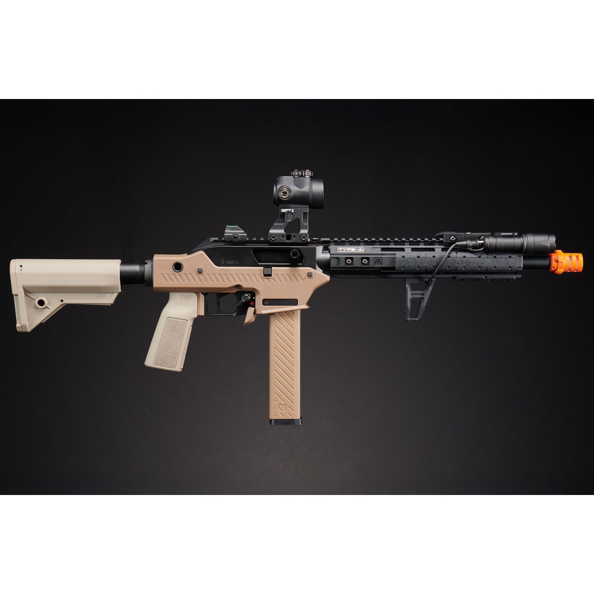 The Custom Desert Cage Vorsk VMP-2M Assault Variant is a compact, select-fire gas blowback (GBB) platform built for aggressive CQB performance and modular customization. Powered by gas with realistic blowback and tuned to 1 J (330 FPS with 0.20 g on V6 fuel), this VMP-2M Assault Variant combines a CNC-finished aluminium upper with high-impact polymer lower and handguard for a balanced, durable build. The 275 mm, 6.03 mm inner barrel and rotary-disc hop-up (TDC/VSR system) deliver repeatable accuracy and easy tuning, while the 20 mm flat-top rail, fiber optic sights, and multiple accessory rails let you mount optics, lights, and offsets fast. Ambidextrous fire controls, a 6-position extendable stock, four QD sling points, 14 mm threaded barrel, and supplied 20-round gas magazine make the rifle ready for rapid transitions and comfortable handling. Internal construction blends steel, brass and aluminium alloy parts with polymer feed lips and nozzle for reliable cycling and straightforward maintenance. This assault variant is engineered for players who demand a short, responsive platform for indoor and urban scenarios - think tight rooms, fast clearing, and intense skirmishes. The modular design supports interchangeable barrels, handguards, and nozzles so you can tailor reach, balance, and role-specific accessories; it also accepts VMP-series mags and common AR15-pattern upgrades for stocks, grips and handguards. Whether you're upgrading to a gas-powered CQB rig or building a versatile primary, the Vorsk VMP-2M delivers realistic GBB recoil, quick target acquisition, and tunable hop-up precision.This is a top pick for players seeking performance and customization in a lightweight, field-ready package. Available now in tan/black - add the Custom Desert Cage to your kit for a competitive edge on the field.