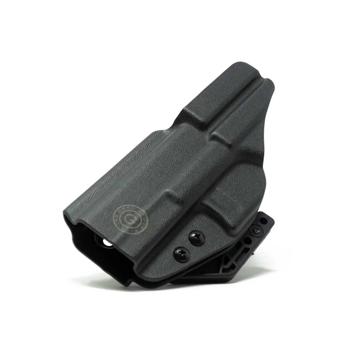 The GBRS Group x Priority 1 IWB Right Handed Glock Holster in black is a premium concealed carry solution designed for shooters who demand reliability, comfort, and precision. Built from 0.080 Boltaron, this holster is rugged yet slim, providing long-lasting durability without unnecessary bulk. It is CNC trimmed, hand finished, and test fit to ensure exact tolerances and superior quality control. The holster features adjustable screw-on retention for a personalized draw and adjustable cant options of 0 or 15 degrees to suit your carry preference. A full sweat guard keeps the rear sight from contacting the body, while the concealment wing rotates the grip inward for improved stability and reduced printing. The discreet carry monoblock clip firmly secures the holster inside the waistband, whether worn with or without a belt, while the adjustable ride height accommodates tuckable belt attachments for flexible concealed carry setups. Engineered for modern everyday carry and professional use, the holster is optics cut ready with a molded RMR channel, ensuring compatibility with most slide-mounted red dot optics. It also supports aftermarket tall suppressor-height sights and features an open muzzle design to accept threaded barrels or compensators. This makes it an ideal option for Glock owners who run upgraded or customized pistols while still requiring a reliable IWB holster. Compatible with Glock 9mm and .40 caliber models, this holster is proudly made in the USA and Berry Compliant, reflecting strict quality and compliance standards. Lightweight, comfortable, and designed with attention to detail, the GBRS Group x Priority 1 IWB Glock Holster provides the perfect balance of concealability, accessibility, and durability. Available now, it is a must-have for anyone seeking a top-tier Glock holster that excels in performance and modern carry requirements.