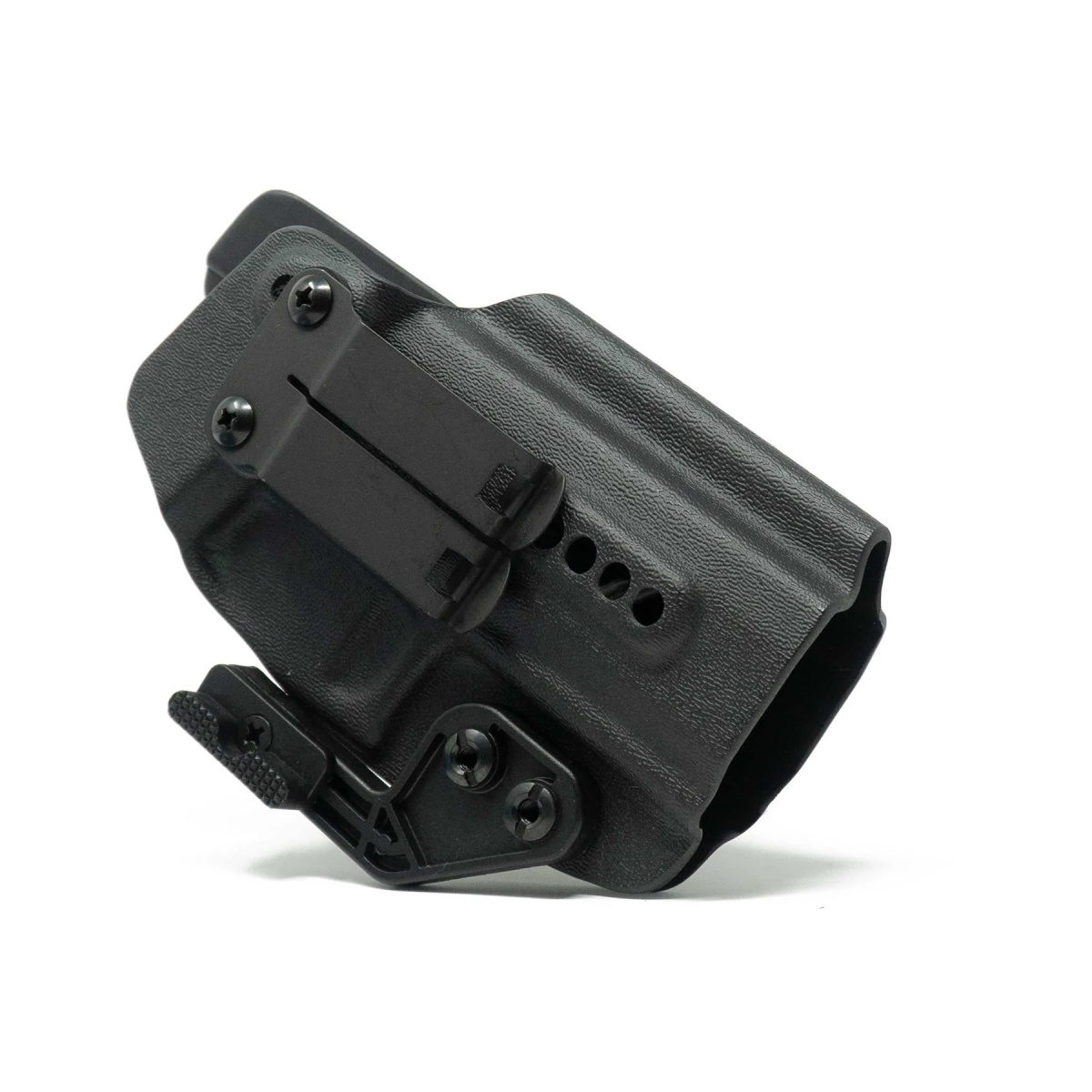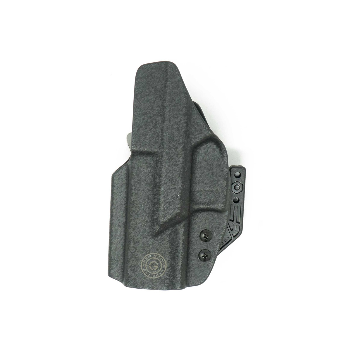 The GBRS Group x Priority 1 IWB Right Handed X300 Compatible Glock Holster in black is a premium concealed carry solution built for Glock owners running SureFire X300U or X300T weapon lights. Engineered from 0.080 Boltaron, this holster offers outstanding durability while maintaining a slim and streamlined profile for everyday carry. It features adjustable screw-on retention and a cant adjustment of 0 or 15 degrees, allowing shooters to customize their draw angle and holster tension. A full sweat guard keeps the rear sight protected from body contact, while the concealment wing rotates the grip inward to minimize printing and increase stability under clothing. The discreet carry monoblock clip secures the holster firmly with or without a belt, and its adjustable ride height provides flexibility with tuckable belt attachments. Precision CNC trimming, hand finishing, and test fitting ensure consistent quality and a perfect fit. This holster is designed with modern pistol setups in mind. The open muzzle design accommodates threaded barrels and compensators, while the molded RMR channel and optics cut allow seamless compatibility with most slide-mounted optics. It also supports aftermarket suppressor-height sights, making it ideal for shooters running upgraded configurations. Fully compatible with Glock 9mm and .40 models such as the 17, 19, 19X, 22, 23, 34, 35, and 45 when paired with SureFire X300 lights, it also works with SIG P320 variants under the same configuration. Proudly made in the USA and Berry Compliant, this holster represents top-tier craftsmanship and mission-ready performance. Whether used for concealed carry, range training, or professional duty, the GBRS Group x Priority 1 IWB Glock Holster delivers the reliability, adjustability, and comfort demanded by serious shooters. Available now, it is the ultimate solution for Glock users seeking a dependable IWB holster built for X300-equipped setups.